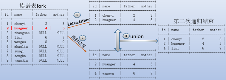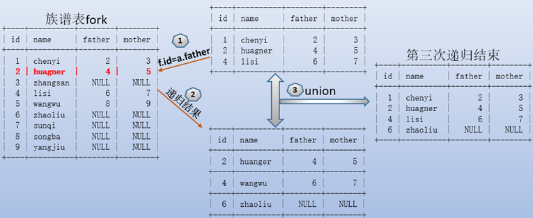 WITH recursive fuxi AS ( SELECT * FROM fork WHERE `name`="chenyi" UNION SELECT f.* FROM fork f JOIN fuxi a WHERE f.id=a.father)SELECT * FROM fuxi;