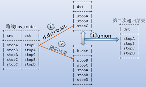 再將定位點(diǎn)成員結(jié)果和bus_routes表聯(lián)接進(jìn)行第一次遞歸,如下圖: