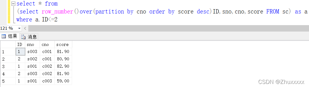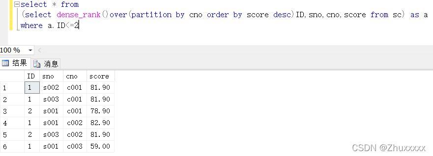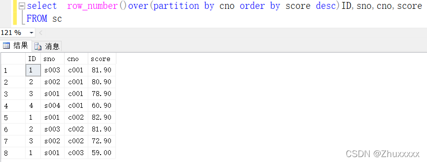 可以看到ID的值以cno為分區進行排序,當cno變化時ID也會自動重新開始計數,然后再將成績以降序排列,這樣每科成績高低及其對應的學號就一目了然。