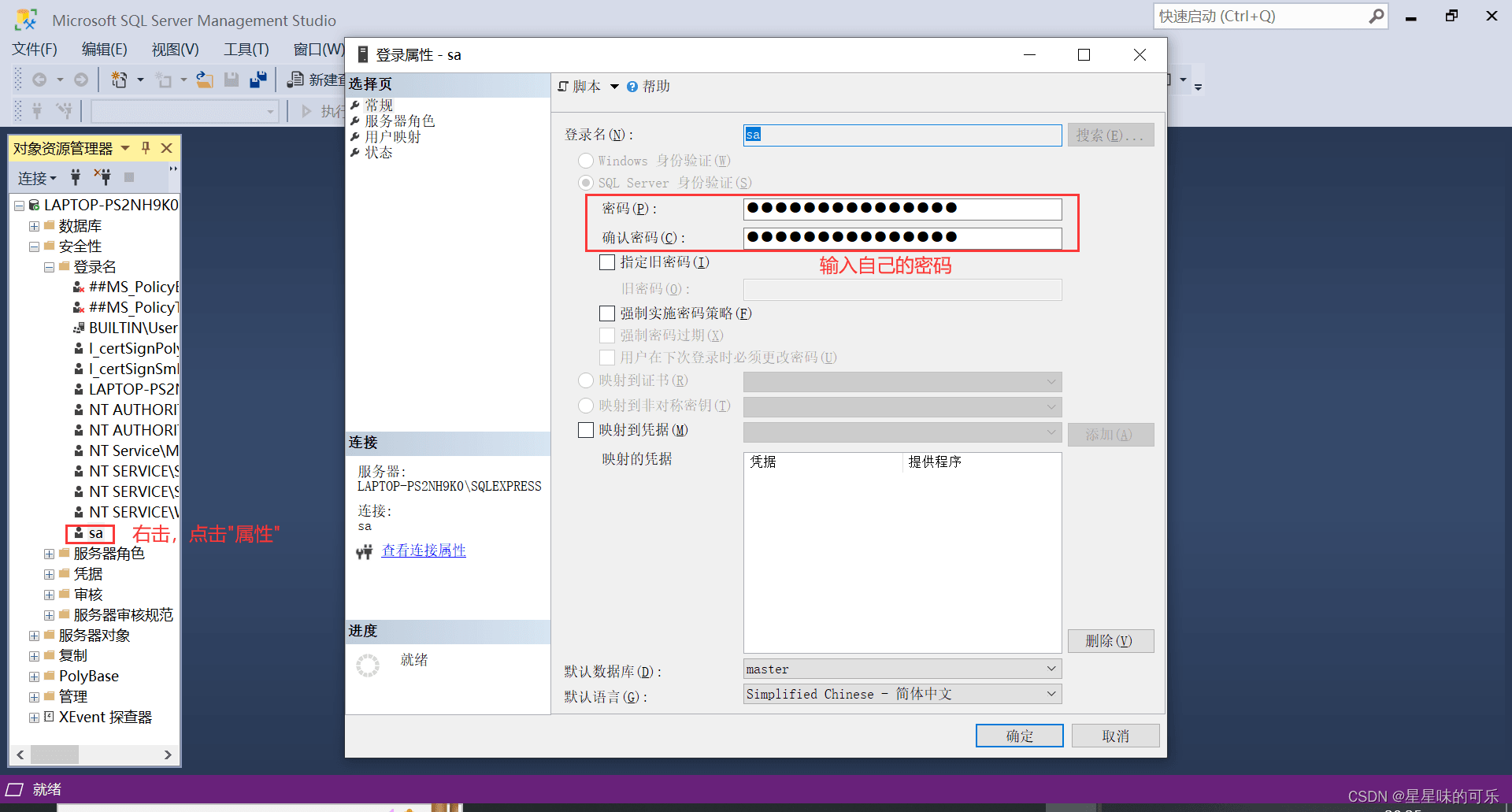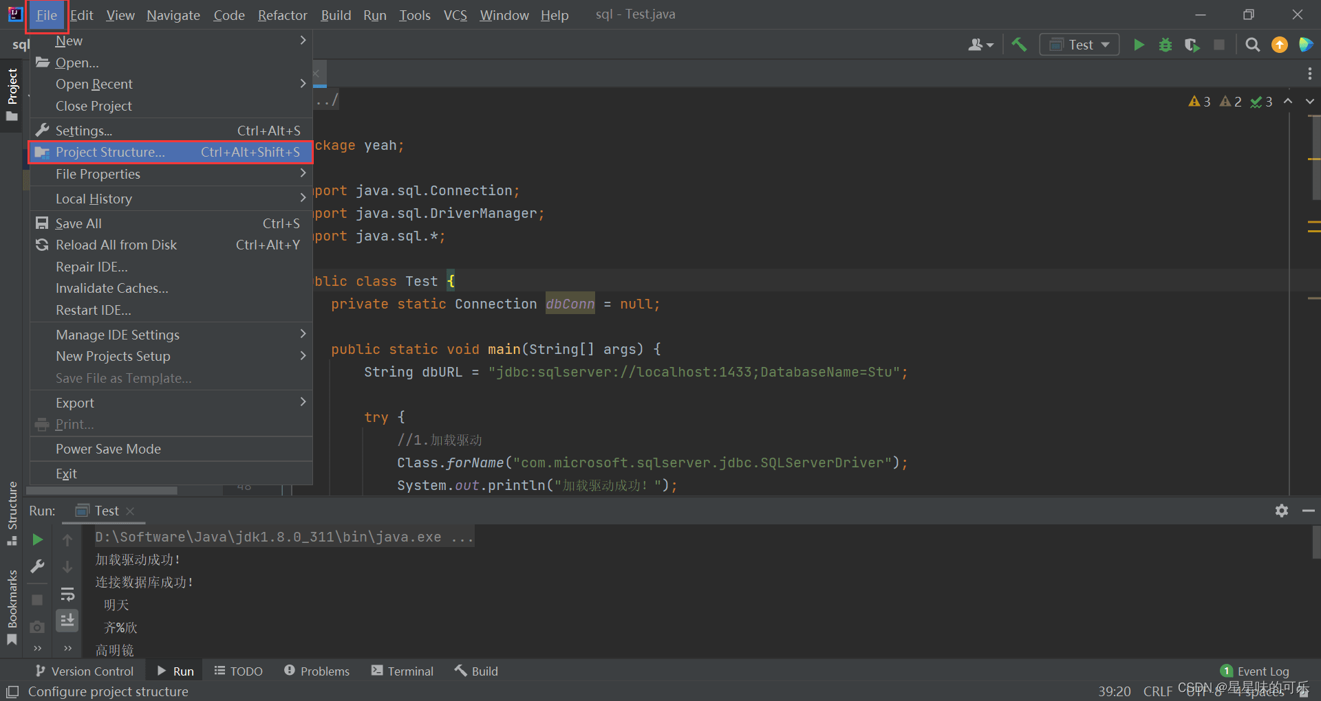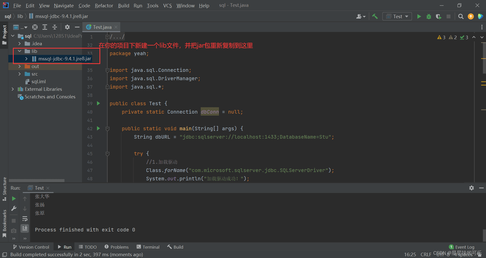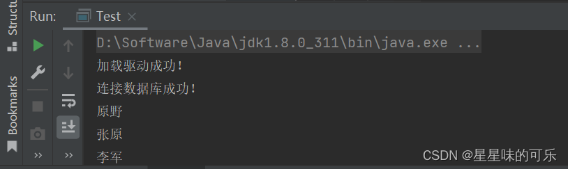 import java.sql.Connection;import java.sql.DriverManager;import java.sql.*;public class Test { private static Connection dbConn = null; public static void main(String[] args) {String dbURL = "jdbc:sqlserver://localhost:1433;DatabaseName=Stu";//這里輸入自己的數據庫名稱(即將Stu改為你自己的數據庫名稱)其余都可以不做修改try { //1.加載驅動 Class.forName("com.microsoft.sqlserver.jdbc.SQLServerDriver"); System.out.println("加載驅動成功!"); //2.連接 dbConn = DriverManager.getConnection(dbURL, "sa", "123");//這里的密碼改為第一步你所修改的密碼,用戶名一般就為"sa" System.out.println("連接數據庫成功!"); String sql="select sname from student";//這個語句就是表的查詢語句,按照你所建的表修改名稱 PreparedStatement statement=null; statement=dbConn.prepareStatement(sql); ResultSet res=null; res=statement.executeQuery(); while(res.next()){String title=res.getString("sname");System.out.println(title); }}catch(Exception e) { e.printStackTrace(); System.out.println("連接數據庫失敗!");} }}