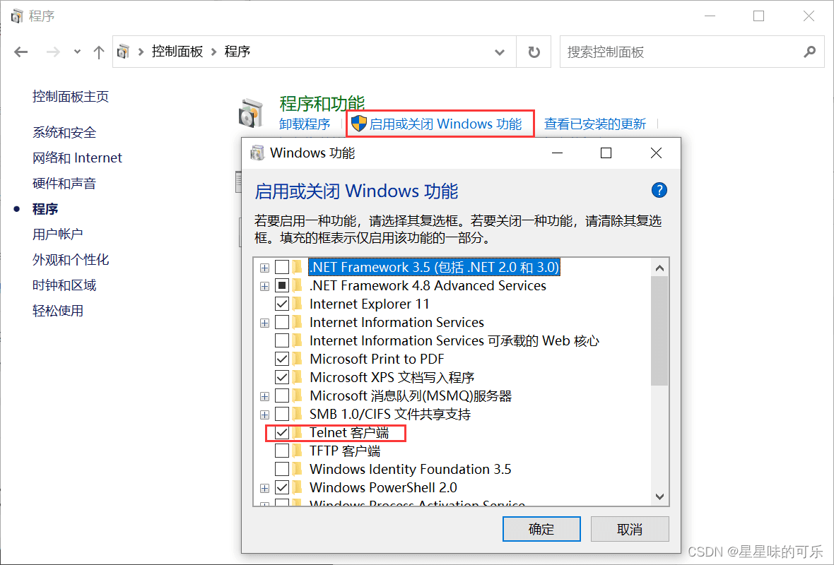 打開控制面板,點擊“程序”,點擊“啟用或關閉Windows功能”,打開Telnet服務。