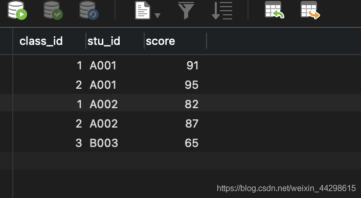 我們對(duì)這個(gè)語句進(jìn)行分析:左表是class表,右表是score表,兩表的class_id為兩表關(guān)聯(lián)字段。當(dāng)左表class_id為1時(shí),右表有兩條記錄的class_id為1;當(dāng)左表class_id為2時(shí),右表有兩條記錄的class_id為2;當(dāng)左表class_id為3時(shí),右表有一條記錄的class_id為3,所以我們應(yīng)當(dāng)?shù)玫轿鍡l記錄: