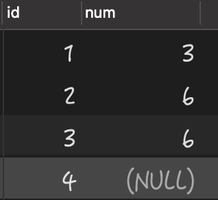 -- 如果存在 goods 表先刪除DROP TABLE IF EXISTS goods; -- 創建 goods 表CREATE TABLE goods ( id INT PRIMARY KEY auto_increment, num int) ENGINE="innodb";-- goods 表添加測試數據insert into goods(num) values(3),(6),(6),(NULL);select * from goods;