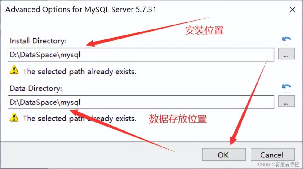 自定義安裝路徑和數據存放路徑,更改完成之后點擊“OK”注:雖說安裝在C盤也沒毛病,但是個人建議不要安裝到C盤,我安裝到了D盤