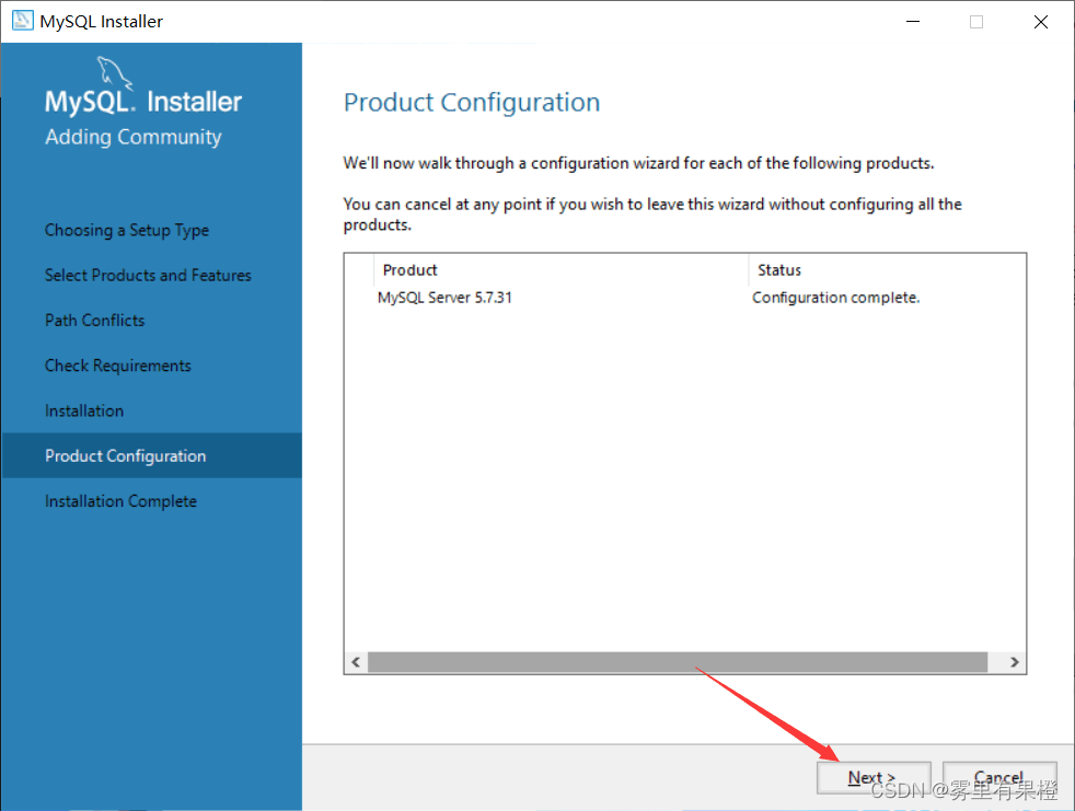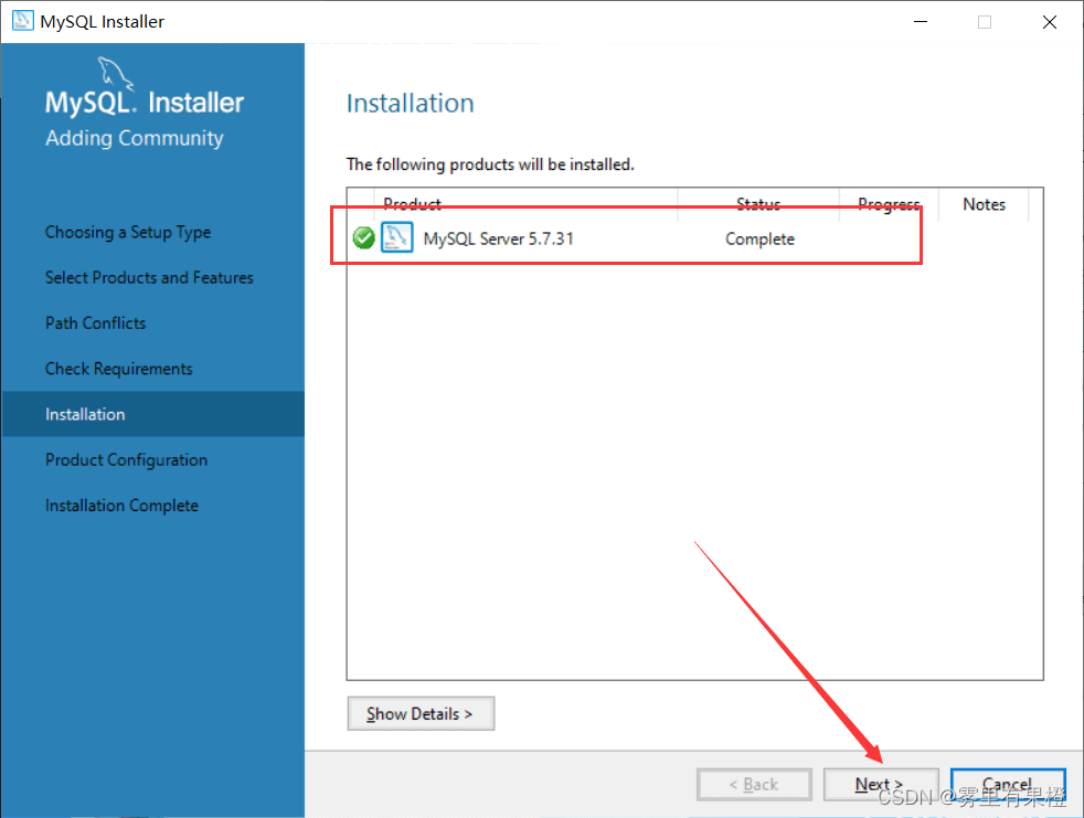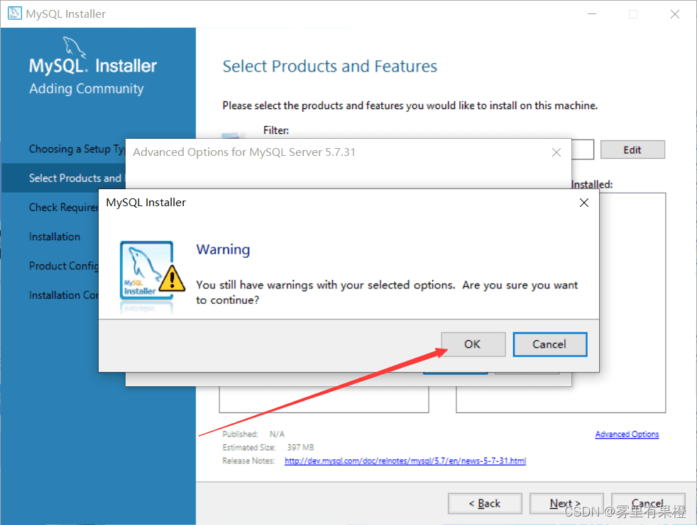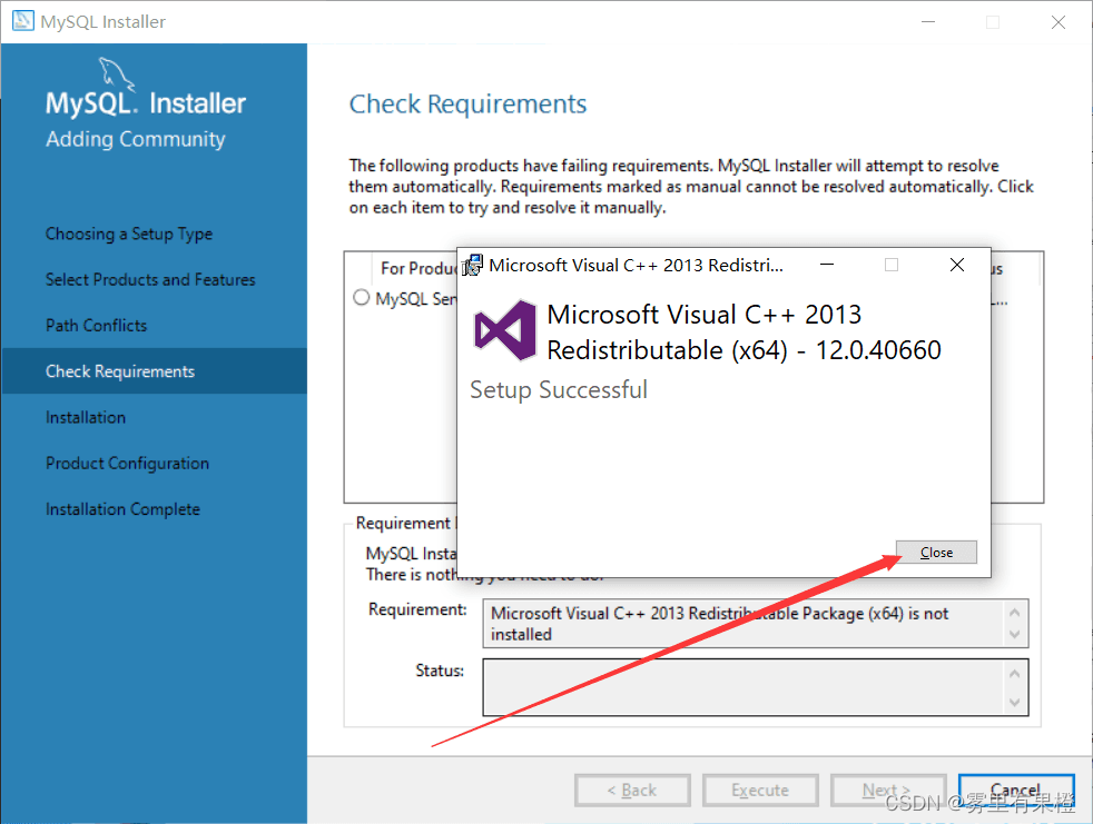 先選中“MySQL Server5.7.31”,若電腦中沒有這個環境,會提示安裝“Microsoft Visual C++ 2013”環境,點擊“Execute”