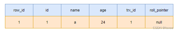 - 在數據庫的每行上,除了存放真實的數據以外,還存在3個隱藏的列:row_id、trx_id和roll_pointer