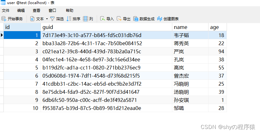 CREATE TABLE `user` ( `id` int NOT NULL AUTO_INCREMENT COMMENT "主鍵", `guid` varchar(255) CHARACTER SET gbk DEFAULT NULL COMMENT "隨機id", `name` varchar(255) CHARACTER SET gbk DEFAULT NULL COMMENT "姓名", `age` int DEFAULT NULL COMMENT "年齡", PRIMARY KEY (`id`)) ENGINE=InnoDB DEFAULT CHARSET=utf8mb4 COLLATE=utf8mb4_general_ci;