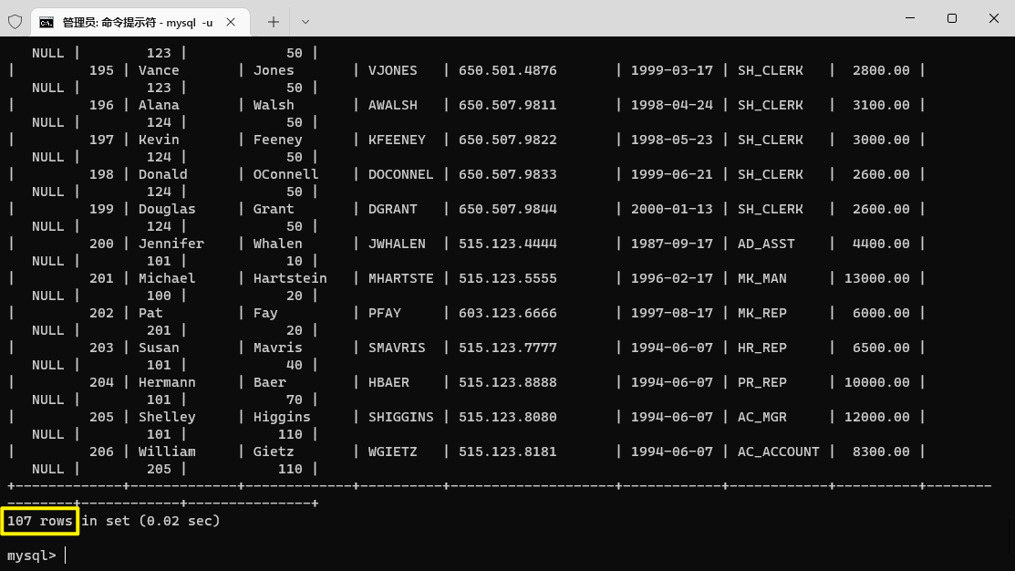 一共107條員工信息,與例子1的數(shù)目一致,導(dǎo)入成功。