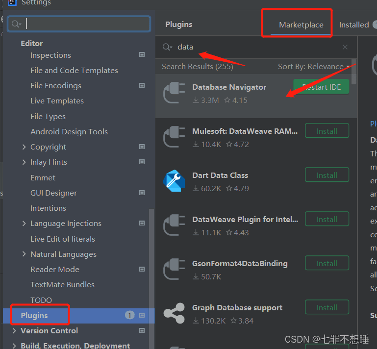 第三步:找到plugins,然后在marketplace輸入data,找到database navigate,點擊install(因為我已經下載了,所以沒有install)