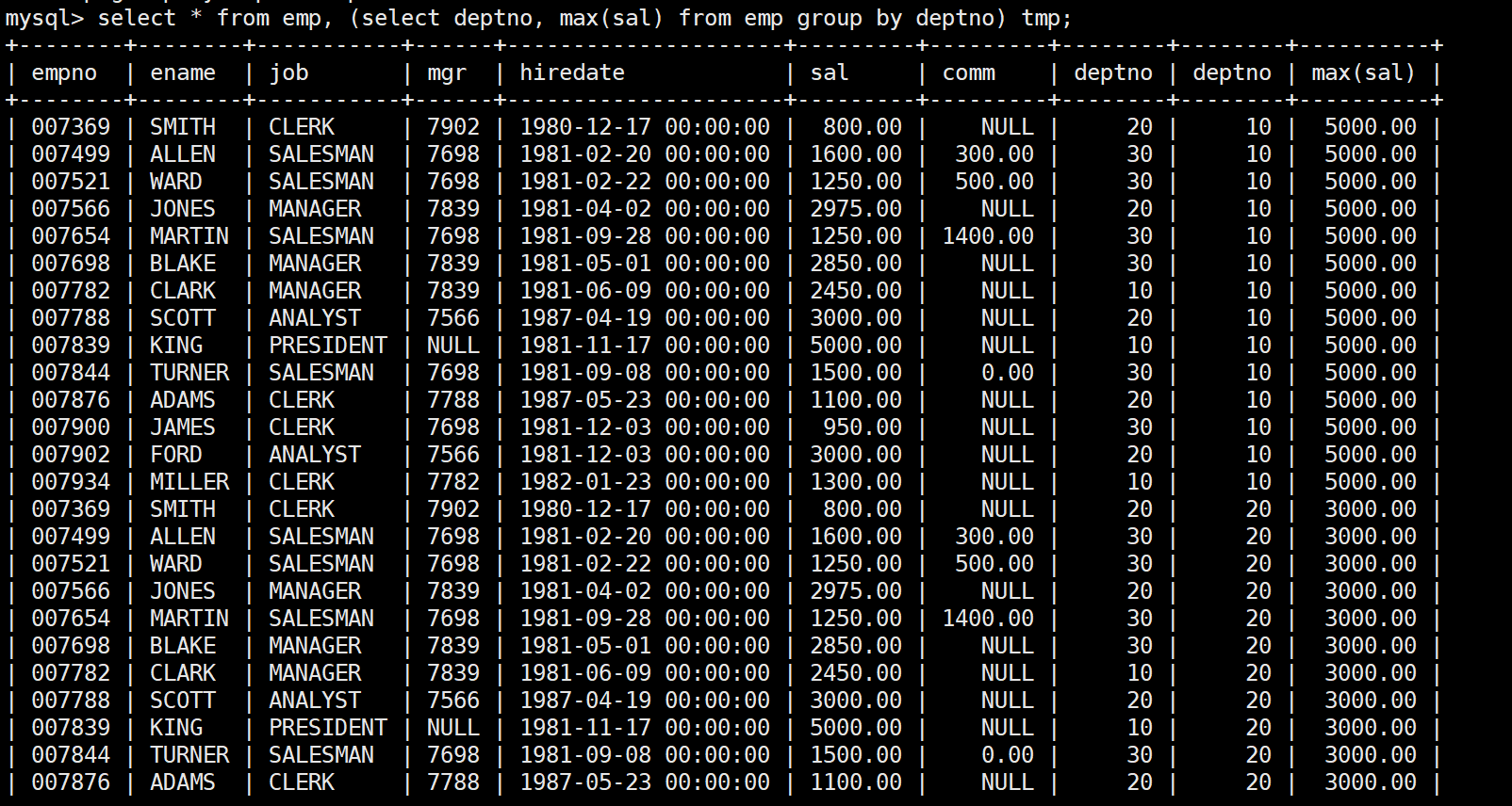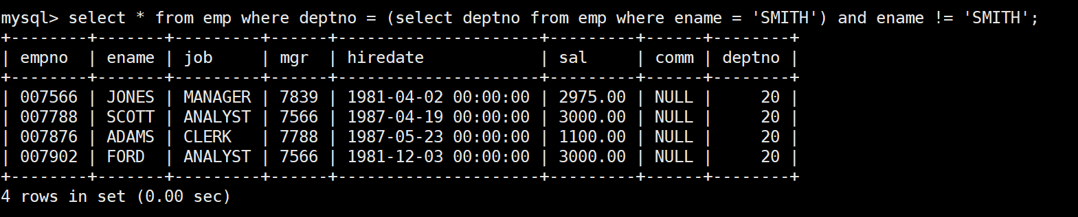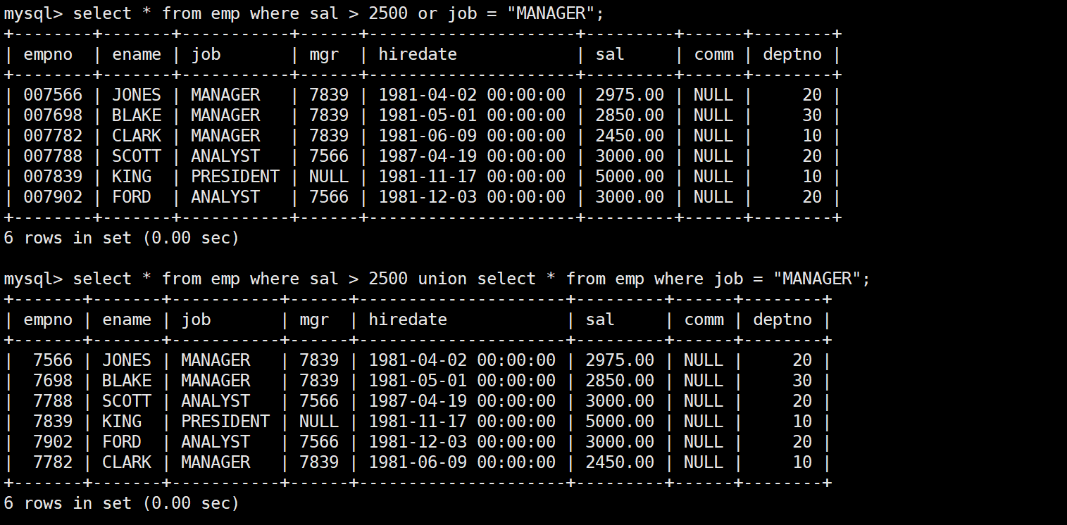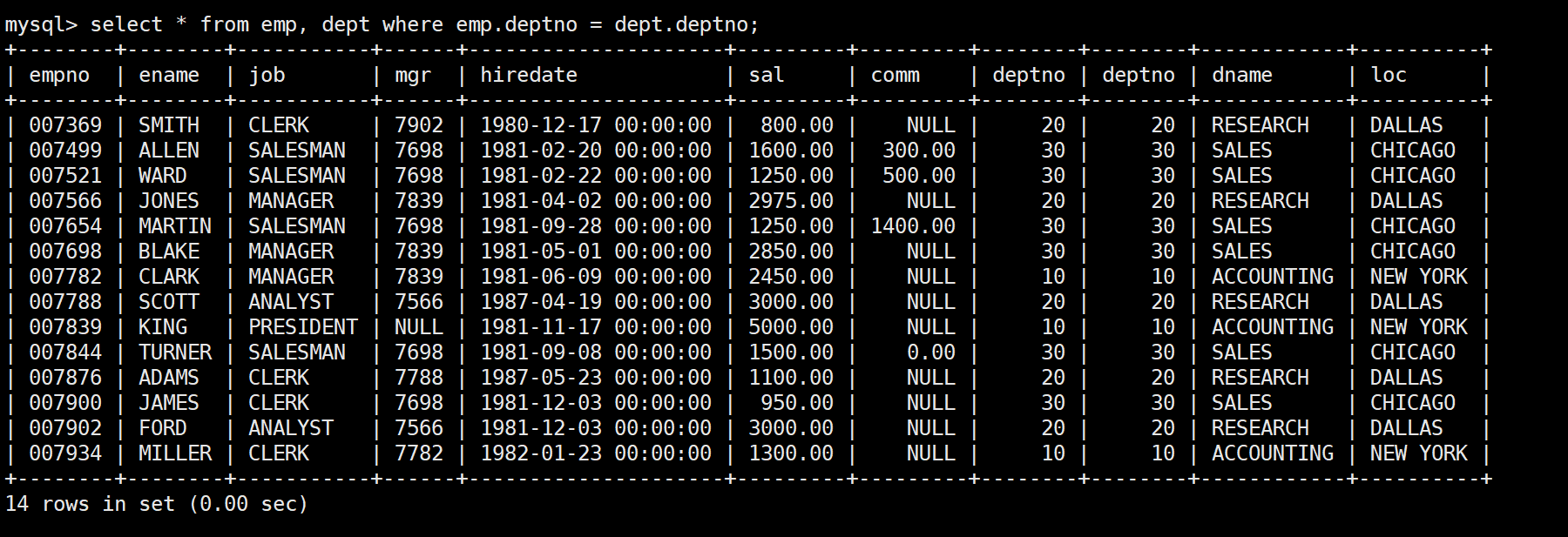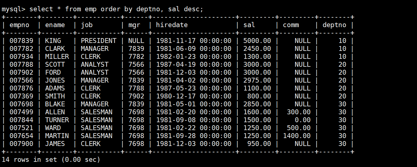 mysql> select * from emp;+--------+--------+-----------+------+---------------------+---------+---------+--------+| empno | ename | job | mgr | hiredate | sal | comm | deptno |+--------+--------+-----------+------+---------------------+---------+---------+--------+| 007369 | SMITH | CLERK | 7902 | 1980-12-17 00:00:00 | 800.00 | NULL | 20 || 007499 | ALLEN | SALESMAN | 7698 | 1981-02-20 00:00:00 | 1600.00 | 300.00 | 30 || 007521 | WARD | SALESMAN | 7698 | 1981-02-22 00:00:00 | 1250.00 | 500.00 | 30 || 007566 | JONES | MANAGER | 7839 | 1981-04-02 00:00:00 | 2975.00 | NULL | 20 || 007654 | MARTIN | SALESMAN | 7698 | 1981-09-28 00:00:00 | 1250.00 | 1400.00 | 30 || 007698 | BLAKE | MANAGER | 7839 | 1981-05-01 00:00:00 | 2850.00 | NULL | 30 || 007782 | CLARK | MANAGER | 7839 | 1981-06-09 00:00:00 | 2450.00 | NULL | 10 || 007788 | SCOTT | ANALYST | 7566 | 1987-04-19 00:00:00 | 3000.00 | NULL | 20 || 007839 | KING | PRESIDENT | NULL | 1981-11-17 00:00:00 | 5000.00 | NULL | 10 || 007844 | TURNER | SALESMAN | 7698 | 1981-09-08 00:00:00 | 1500.00 | 0.00 | 30 || 007876 | ADAMS | CLERK | 7788 | 1987-05-23 00:00:00 | 1100.00 | NULL | 20 || 007900 | JAMES | CLERK | 7698 | 1981-12-03 00:00:00 | 950.00 | NULL | 30 || 007902 | FORD | ANALYST | 7566 | 1981-12-03 00:00:00 | 3000.00 | NULL | 20 || 007934 | MILLER | CLERK | 7782 | 1982-01-23 00:00:00 | 1300.00 | NULL | 10 |+--------+--------+-----------+------+---------------------+---------+---------+--------+14 rows in set (0.00 sec)