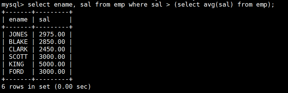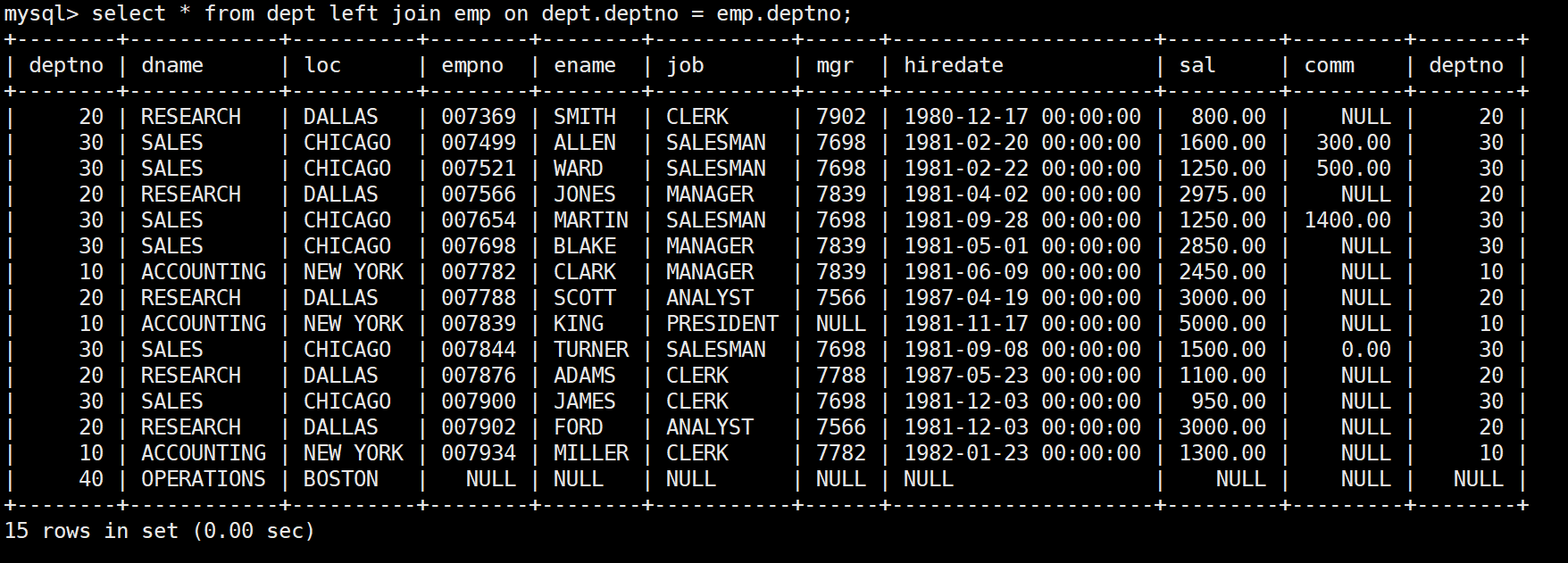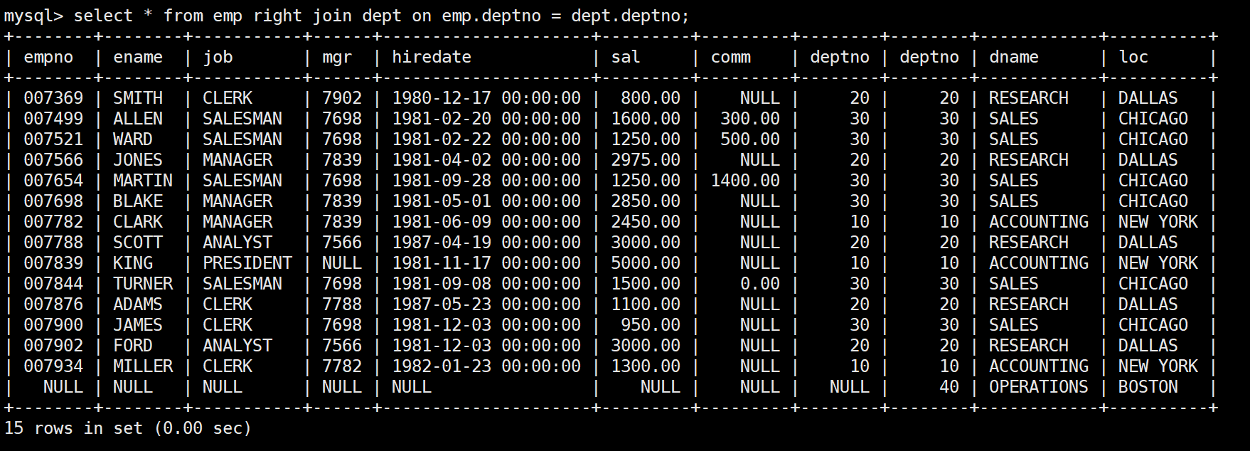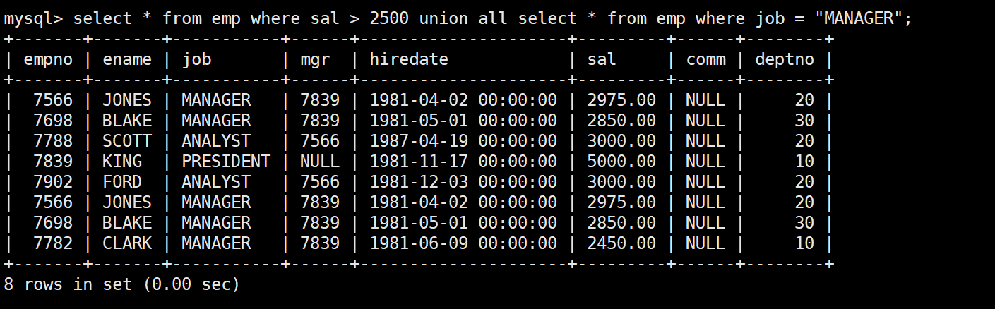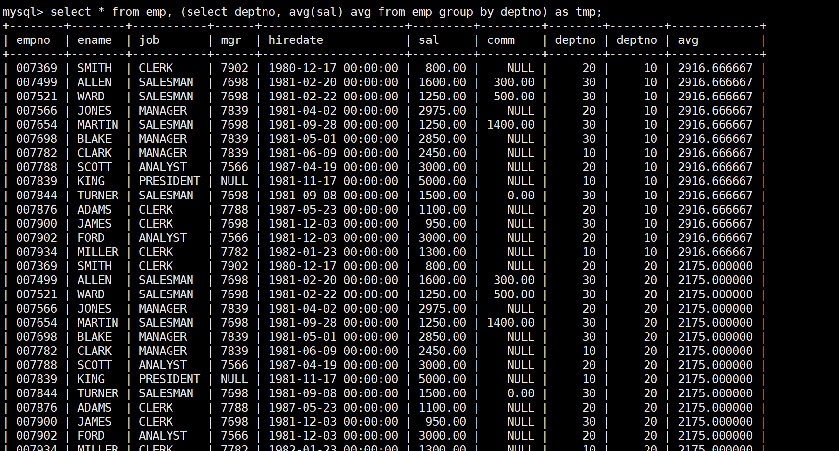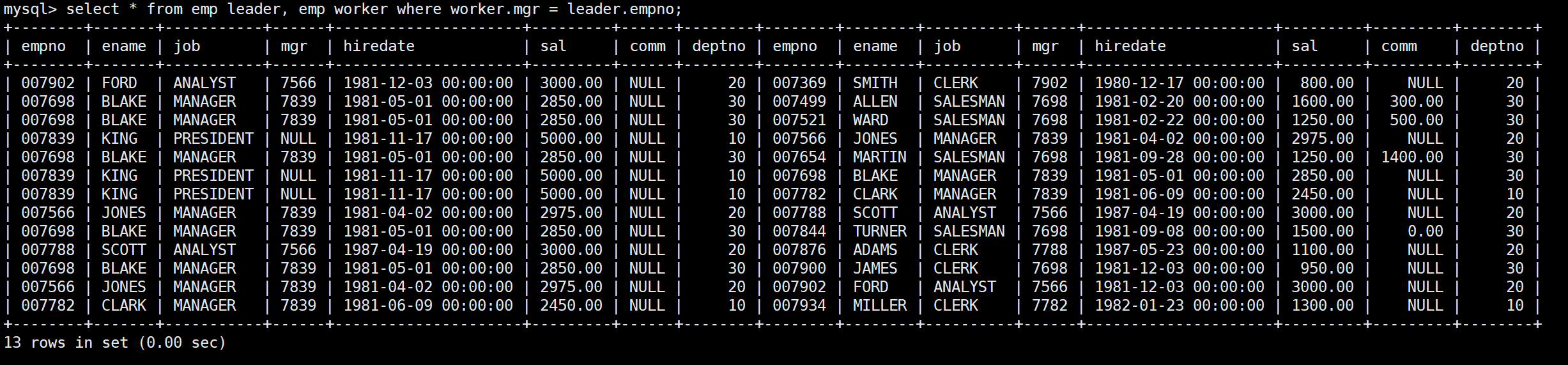 mysql> select * from emp;+--------+--------+-----------+------+---------------------+---------+---------+--------+| empno | ename | job | mgr | hiredate | sal | comm | deptno |+--------+--------+-----------+------+---------------------+---------+---------+--------+| 007369 | SMITH | CLERK | 7902 | 1980-12-17 00:00:00 | 800.00 | NULL | 20 || 007499 | ALLEN | SALESMAN | 7698 | 1981-02-20 00:00:00 | 1600.00 | 300.00 | 30 || 007521 | WARD | SALESMAN | 7698 | 1981-02-22 00:00:00 | 1250.00 | 500.00 | 30 || 007566 | JONES | MANAGER | 7839 | 1981-04-02 00:00:00 | 2975.00 | NULL | 20 || 007654 | MARTIN | SALESMAN | 7698 | 1981-09-28 00:00:00 | 1250.00 | 1400.00 | 30 || 007698 | BLAKE | MANAGER | 7839 | 1981-05-01 00:00:00 | 2850.00 | NULL | 30 || 007782 | CLARK | MANAGER | 7839 | 1981-06-09 00:00:00 | 2450.00 | NULL | 10 || 007788 | SCOTT | ANALYST | 7566 | 1987-04-19 00:00:00 | 3000.00 | NULL | 20 || 007839 | KING | PRESIDENT | NULL | 1981-11-17 00:00:00 | 5000.00 | NULL | 10 || 007844 | TURNER | SALESMAN | 7698 | 1981-09-08 00:00:00 | 1500.00 | 0.00 | 30 || 007876 | ADAMS | CLERK | 7788 | 1987-05-23 00:00:00 | 1100.00 | NULL | 20 || 007900 | JAMES | CLERK | 7698 | 1981-12-03 00:00:00 | 950.00 | NULL | 30 || 007902 | FORD | ANALYST | 7566 | 1981-12-03 00:00:00 | 3000.00 | NULL | 20 || 007934 | MILLER | CLERK | 7782 | 1982-01-23 00:00:00 | 1300.00 | NULL | 10 |+--------+--------+-----------+------+---------------------+---------+---------+--------+14 rows in set (0.00 sec)