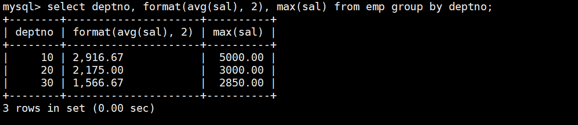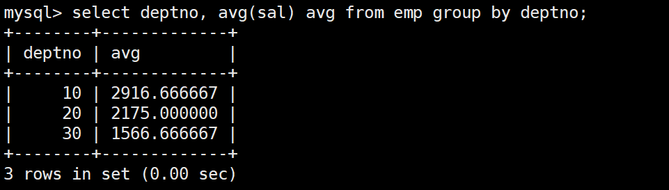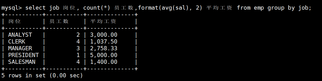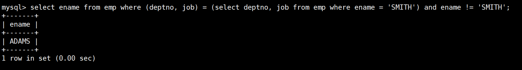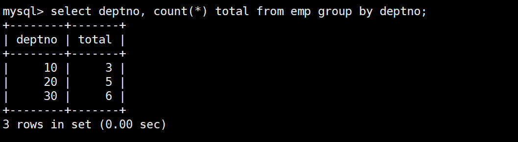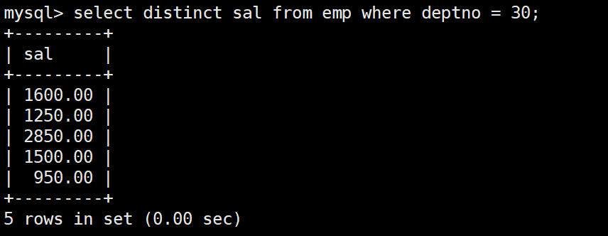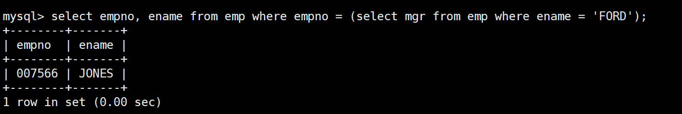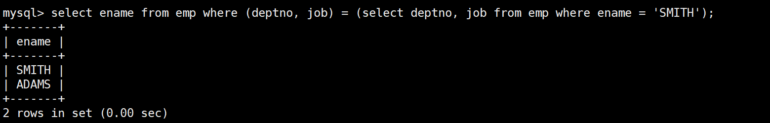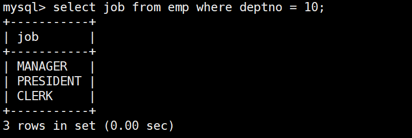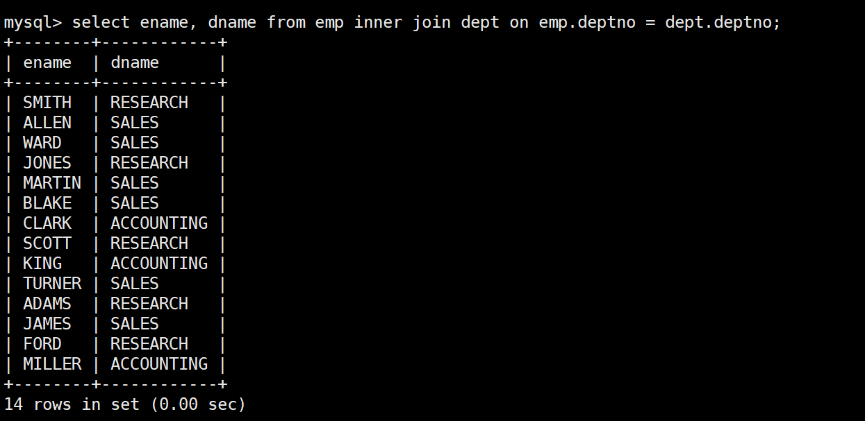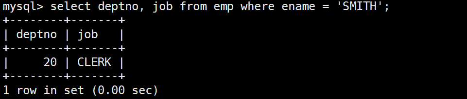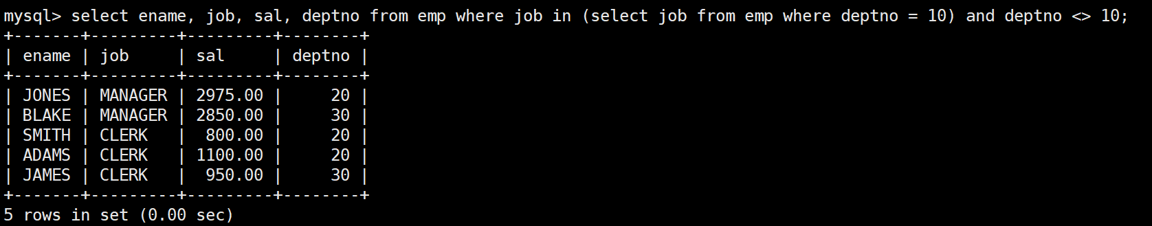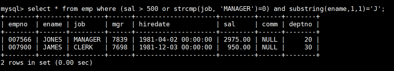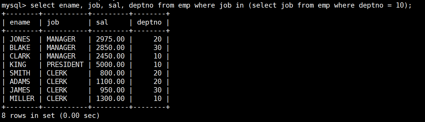 mysql> select * from emp;+--------+--------+-----------+------+---------------------+---------+---------+--------+| empno | ename | job | mgr | hiredate | sal | comm | deptno |+--------+--------+-----------+------+---------------------+---------+---------+--------+| 007369 | SMITH | CLERK | 7902 | 1980-12-17 00:00:00 | 800.00 | NULL | 20 || 007499 | ALLEN | SALESMAN | 7698 | 1981-02-20 00:00:00 | 1600.00 | 300.00 | 30 || 007521 | WARD | SALESMAN | 7698 | 1981-02-22 00:00:00 | 1250.00 | 500.00 | 30 || 007566 | JONES | MANAGER | 7839 | 1981-04-02 00:00:00 | 2975.00 | NULL | 20 || 007654 | MARTIN | SALESMAN | 7698 | 1981-09-28 00:00:00 | 1250.00 | 1400.00 | 30 || 007698 | BLAKE | MANAGER | 7839 | 1981-05-01 00:00:00 | 2850.00 | NULL | 30 || 007782 | CLARK | MANAGER | 7839 | 1981-06-09 00:00:00 | 2450.00 | NULL | 10 || 007788 | SCOTT | ANALYST | 7566 | 1987-04-19 00:00:00 | 3000.00 | NULL | 20 || 007839 | KING | PRESIDENT | NULL | 1981-11-17 00:00:00 | 5000.00 | NULL | 10 || 007844 | TURNER | SALESMAN | 7698 | 1981-09-08 00:00:00 | 1500.00 | 0.00 | 30 || 007876 | ADAMS | CLERK | 7788 | 1987-05-23 00:00:00 | 1100.00 | NULL | 20 || 007900 | JAMES | CLERK | 7698 | 1981-12-03 00:00:00 | 950.00 | NULL | 30 || 007902 | FORD | ANALYST | 7566 | 1981-12-03 00:00:00 | 3000.00 | NULL | 20 || 007934 | MILLER | CLERK | 7782 | 1982-01-23 00:00:00 | 1300.00 | NULL | 10 |+--------+--------+-----------+------+---------------------+---------+---------+--------+14 rows in set (0.00 sec)