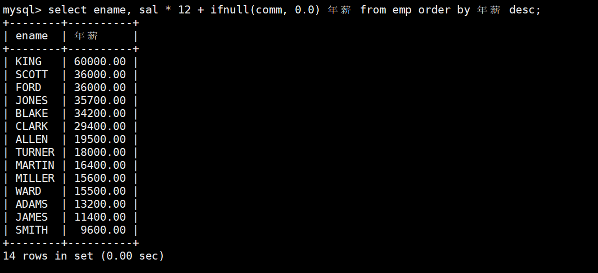 注意:年薪 = 月薪 * 12 + 績效獎,其中有的績效comm為NULL,在MySQL中有NULL參與運算的結(jié)果都為NULL,因此要使用到ifnull函數(shù)。