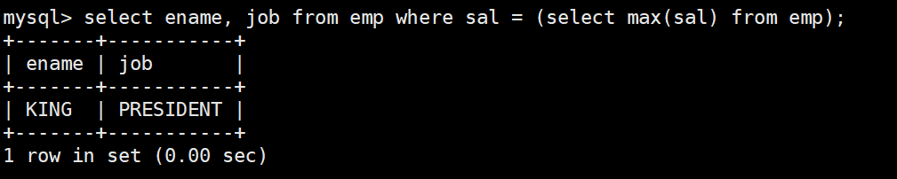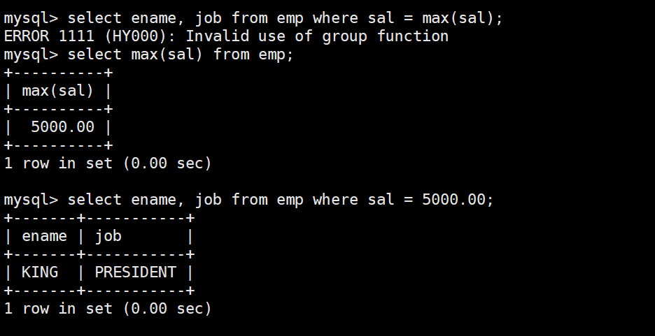 注意:因為要使用到max聚合函數(shù),因此不能直接將聚會函數(shù)返回的結(jié)果作為where篩選的條件去找某一個具體的記錄。因此可以先找出最大的薪資,在根據(jù)薪資找到該條記錄。