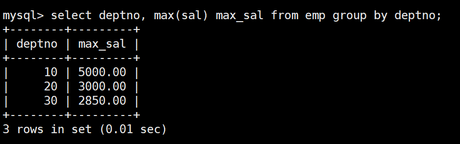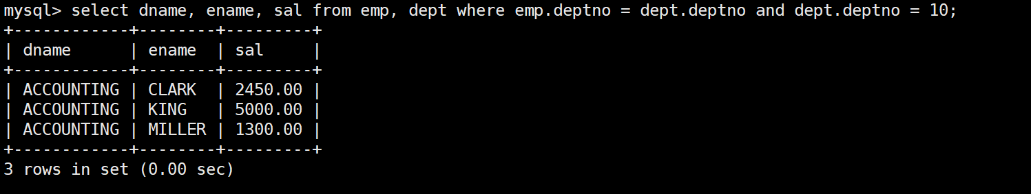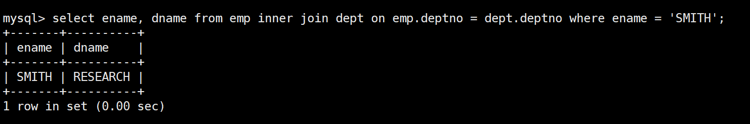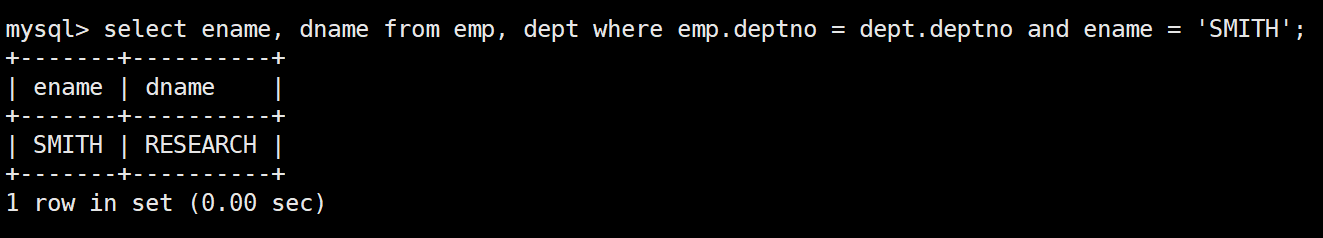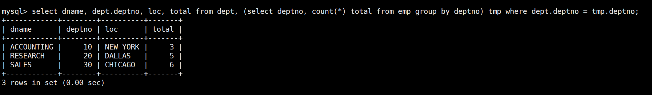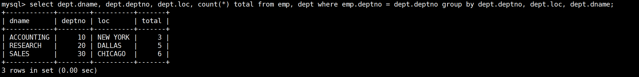 mysql> select * from dept;+--------+------------+----------+| deptno | dname | loc |+--------+------------+----------+| 10 | ACCOUNTING | NEW YORK || 20 | RESEARCH | DALLAS || 30 | SALES | CHICAGO || 40 | OPERATIONS | BOSTON |+--------+------------+----------+4 rows in set (0.00 sec)