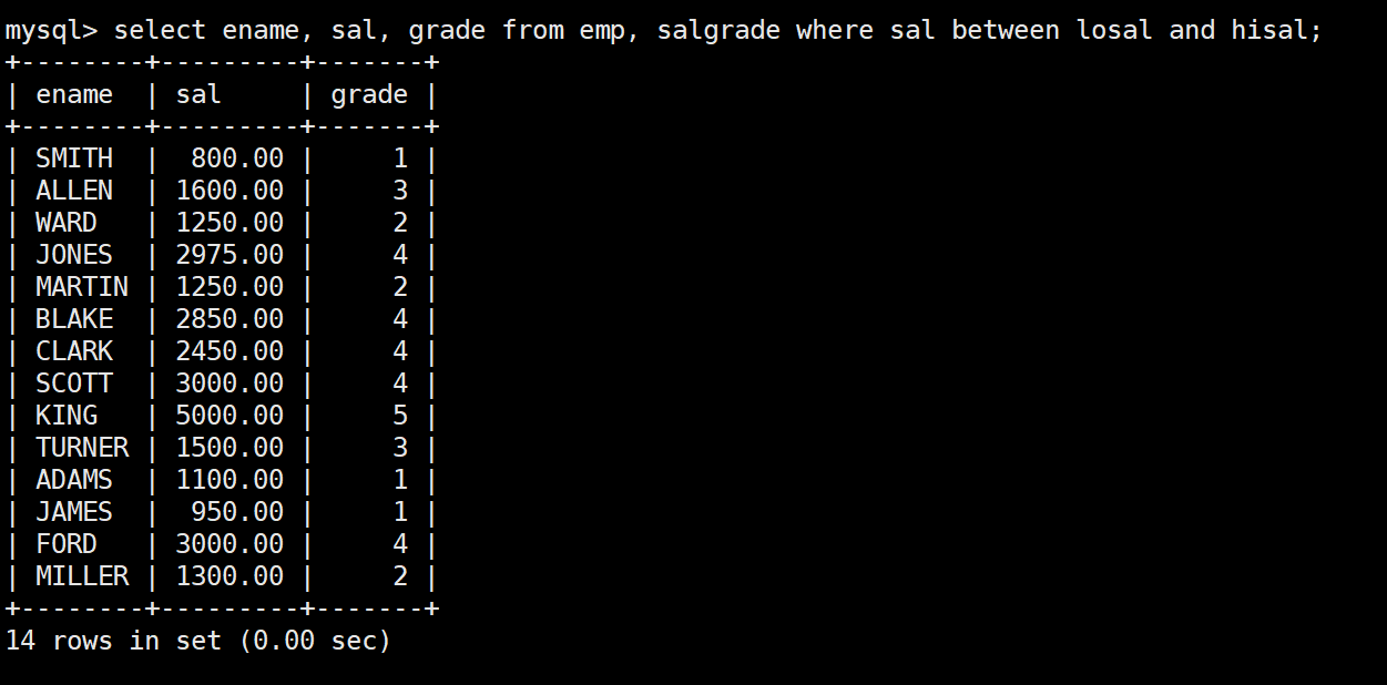 mysql> select * from salgrade;+-------+-------+-------+| grade | losal | hisal |+-------+-------+-------+| 1 | 700 | 1200 || 2 | 1201 | 1400 || 3 | 1401 | 2000 || 4 | 2001 | 3000 || 5 | 3001 | 9999 |+-------+-------+-------+5 rows in set (0.00 sec)