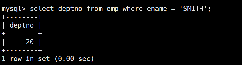 首先從emp表中找出SMITH所在部門的部門號: