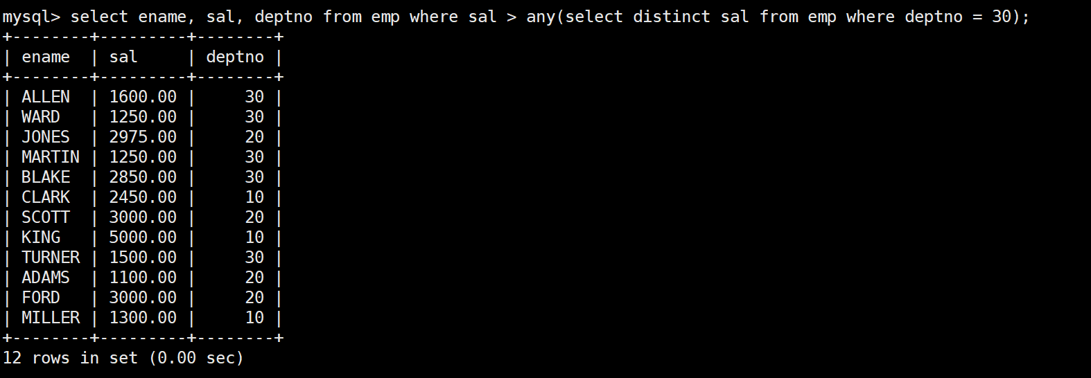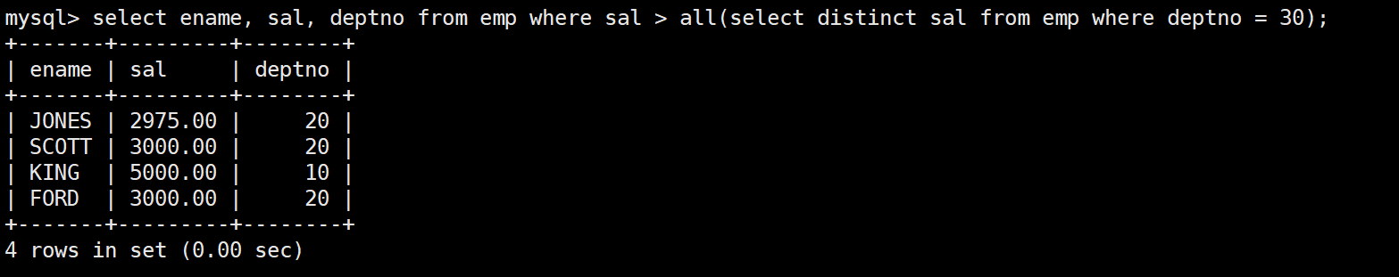 任一當然也包含了30號部門的內(nèi)部員工,因此只需大于30號部門最低的員工工資的員工都會被篩選出來。