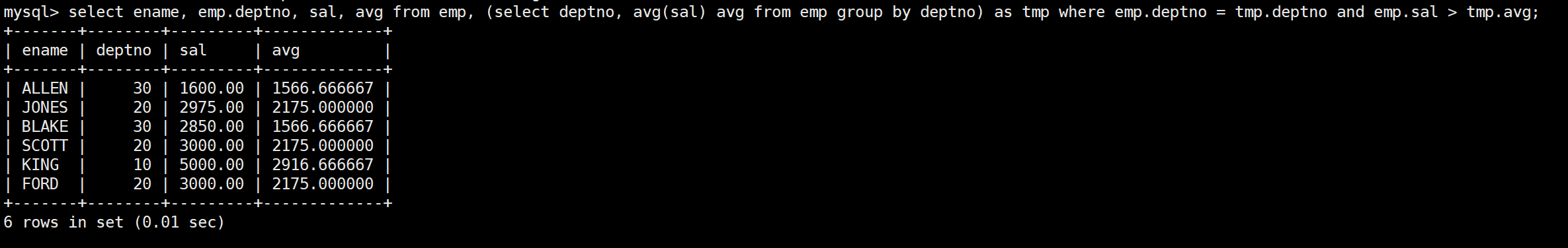 最后在笛卡爾積表當中篩選出每個高于自己部門平均工資的員工的姓名、部門、工資、平均工資