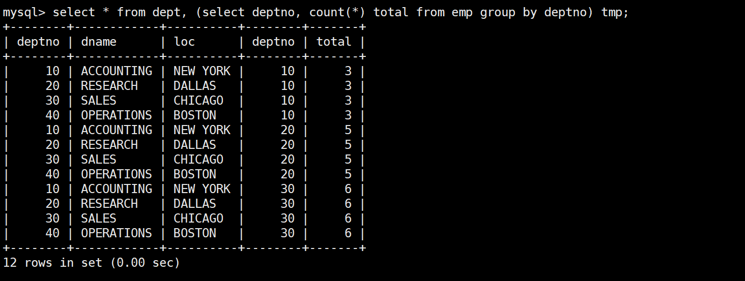 將查詢結(jié)果作為一張臨時表,獲取其與emp表的笛卡爾積