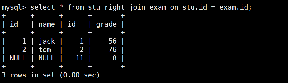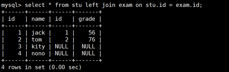 -- 建兩張表create table stu (id int, name varchar(30)); -- 學生表insert into stu values(1,"jack"),(2,"tom"),(3,"kity"),(4,"nono");create table exam (id int, grade int); -- 成績表insert into exam values(1, 56),(2,76),(11, 8);