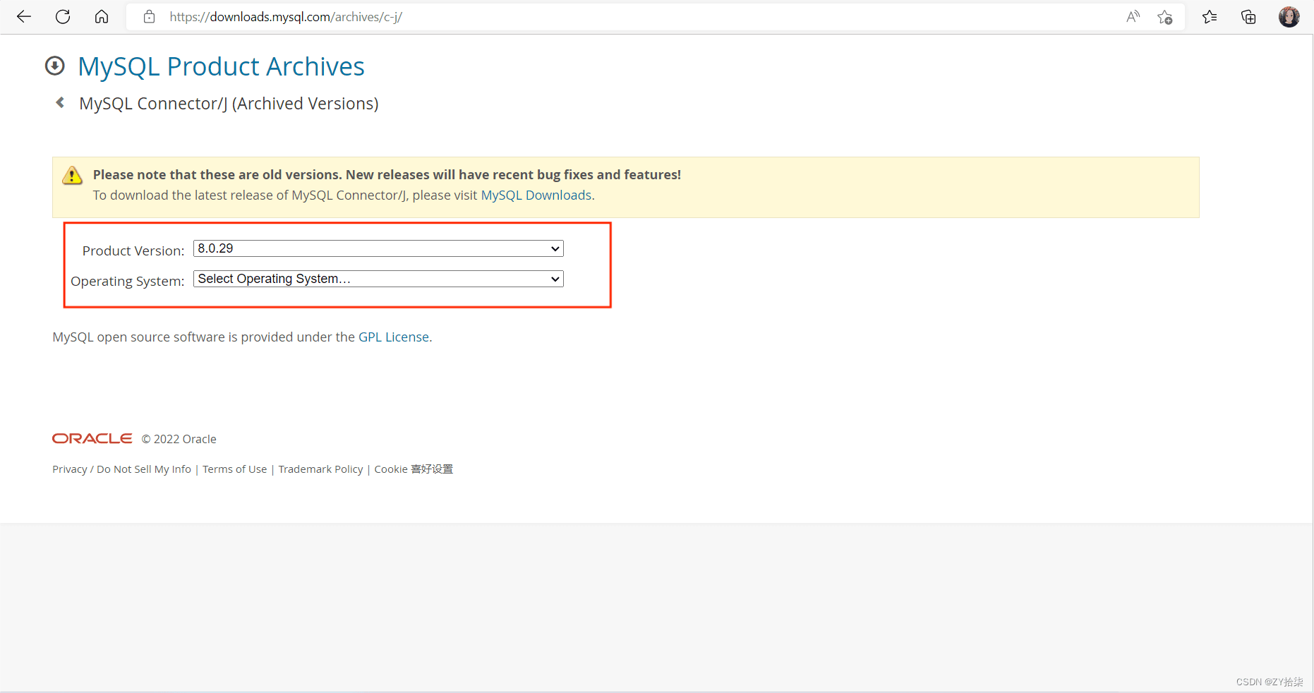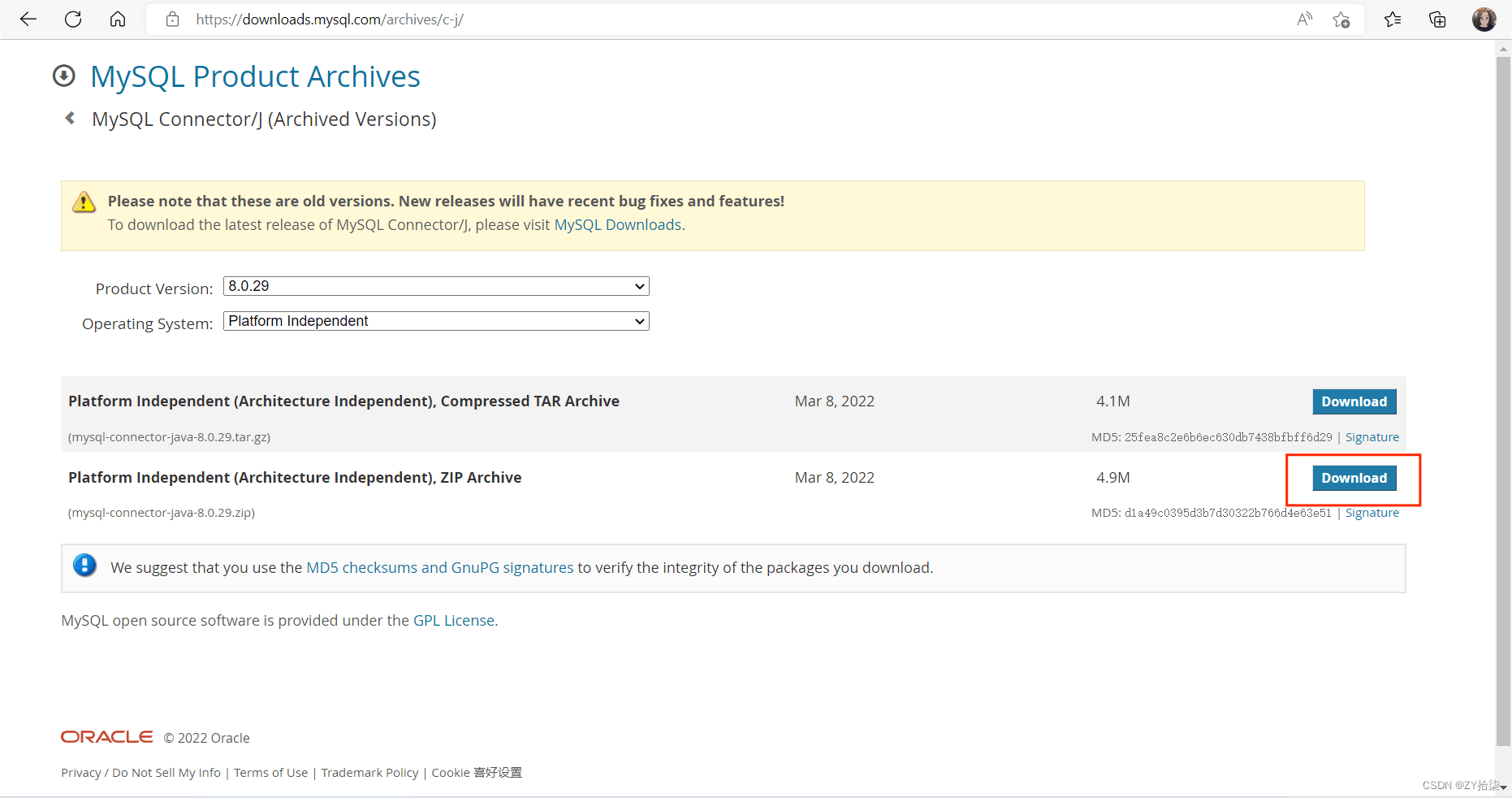 這里注意一下:要選擇與自己數據庫版本相一致(eg:我的為8.0.29)