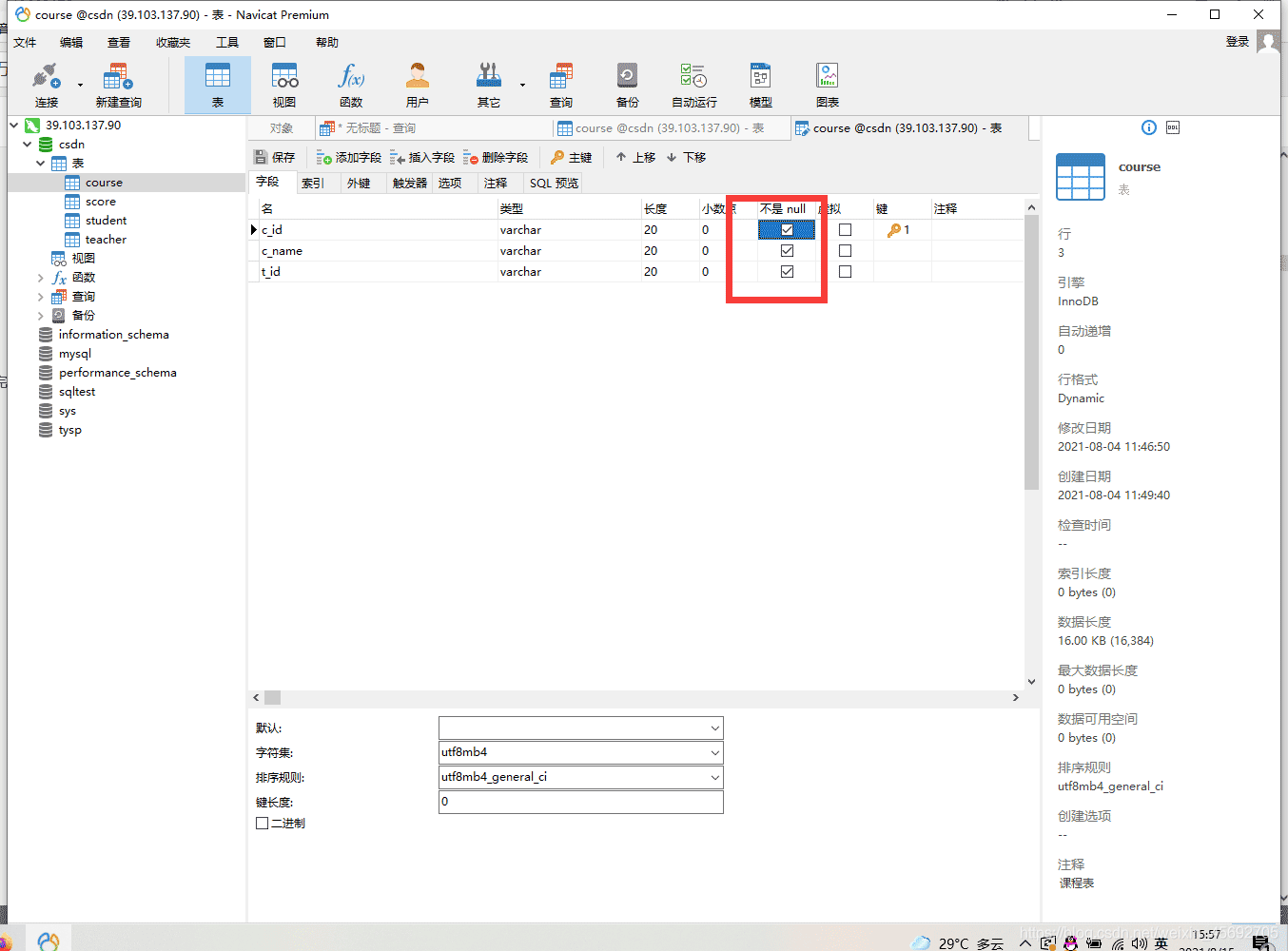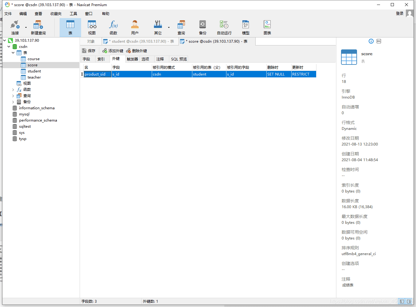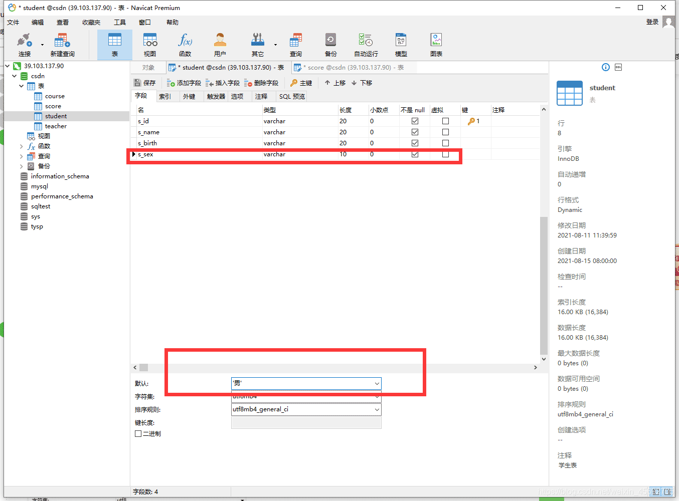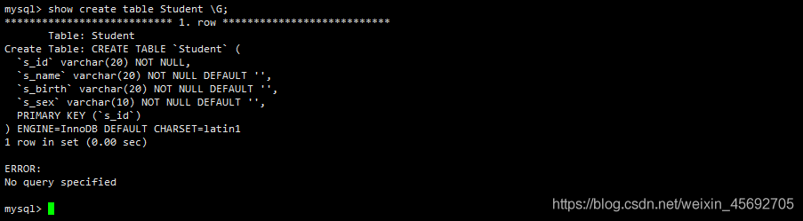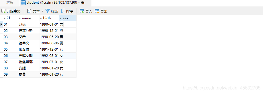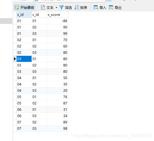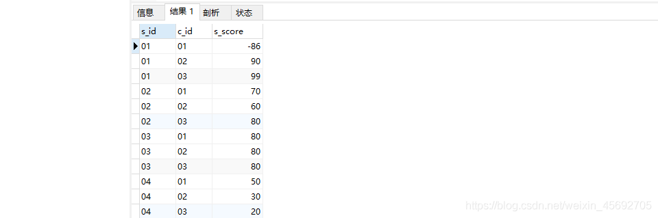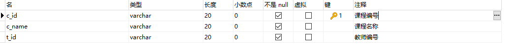 -- 學生表CREATE TABLE `student`(`s_id` VARCHAR(20),`s_name` VARCHAR(20) NOT NULL DEFAULT "",`s_birth` VARCHAR(20) NOT NULL DEFAULT "",`s_sex` VARCHAR(10) NOT NULL DEFAULT "",PRIMARY KEY(`s_id`));-- 課程表CREATE TABLE `course`(`c_id` VARCHAR(20),`c_name` VARCHAR(20) NOT NULL DEFAULT "",`t_id` VARCHAR(20) NOT NULL,PRIMARY KEY(`c_id`));-- 教師表CREATE TABLE `teacher`(`t_id` VARCHAR(20),`t_name` VARCHAR(20) NOT NULL DEFAULT "",PRIMARY KEY(`t_id`));-- 成績表CREATE TABLE `score`(`s_id` VARCHAR(20),`c_id` VARCHAR(20),`s_score` INT(3),PRIMARY KEY(`s_id`,`c_id`));-- 插入學生表測試數據insert into student values("01" , "趙信" , "1990-01-01" , "男");insert into student values("02" , "德萊厄斯" , "1990-12-21" , "男");insert into student values("03" , "艾希" , "1990-05-20" , "男");insert into student values("04" , "德萊文" , "1990-08-06" , "男");insert into student values("05" , "俄洛依" , "1991-12-01" , "女");insert into student values("06" , "光輝女郎" , "1992-03-01" , "女");insert into student values("07" , "崔絲塔娜" , "1989-07-01" , "女");insert into student values("08" , "安妮" , "1990-01-20" , "女");-- 課程表測試數據insert into course values("01" , "語文" , "02");insert into course values("02" , "數學" , "01");insert into course values("03" , "英語" , "03");-- 教師表測試數據insert into teacher values("01" , "死亡歌頌者");insert into teacher values("02" , "流浪法師");insert into teacher values("03" , "邪惡小法師");-- 成績表測試數據insert into score values("01" , "01" , 80);insert into score values("01" , "02" , 90);insert into score values("01" , "03" , 99);insert into score values("02" , "01" , 70);insert into score values("02" , "02" , 60);insert into score values("02" , "03" , 80);insert into score values("03" , "01" , 80);insert into score values("03" , "02" , 80);insert into score values("03" , "03" , 80);insert into score values("04" , "01" , 50);insert into score values("04" , "02" , 30);insert into score values("04" , "03" , 20);insert into score values("05" , "01" , 76);insert into score values("05" , "02" , 87);insert into score values("06" , "01" , 31);insert into score values("06" , "03" , 34);insert into score values("07" , "02" , 89);insert into score values("07" , "03" , 98);表結構 這里建的表主要用于sql語句的練習,所以并沒有遵守一些規范。下面讓我們來看看相關的表結構吧