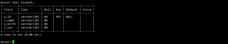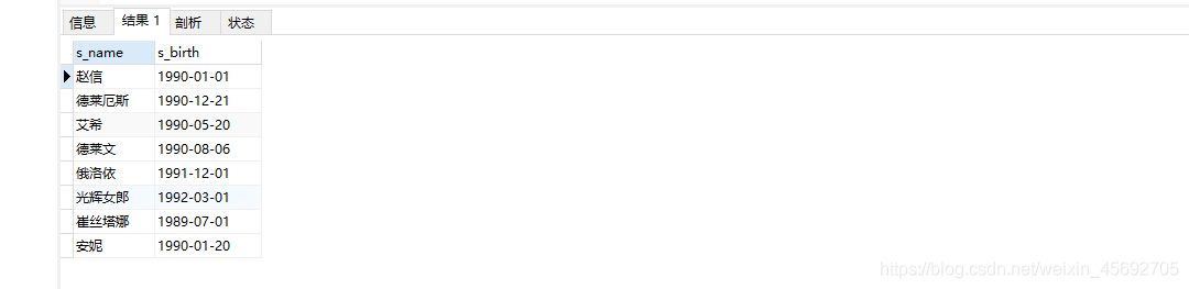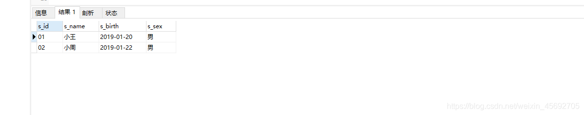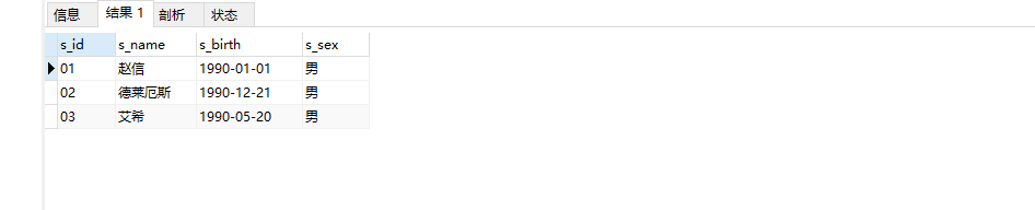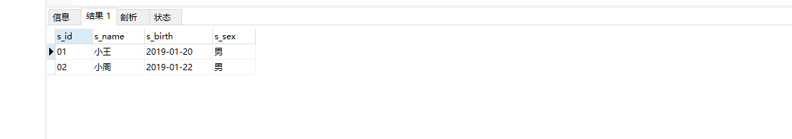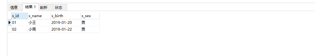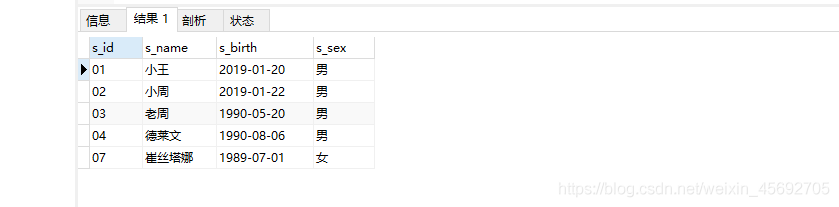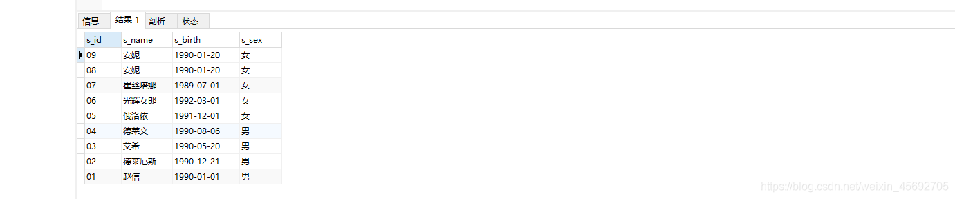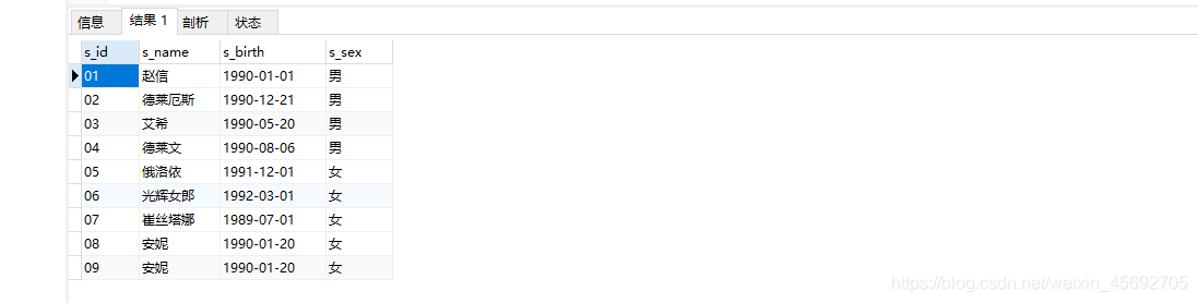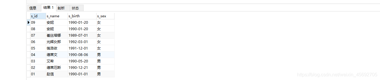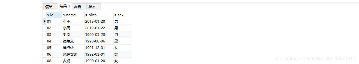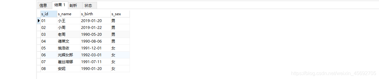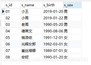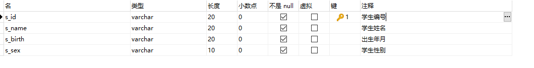 s_id = 學生編號,s_name = 學生姓名,s_birth = 出生年月,s_sex = 學生性別