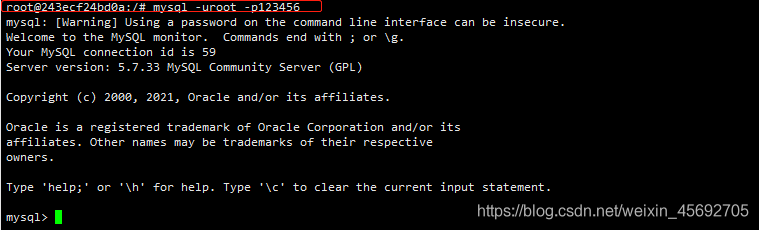 root@243ecf24bd0a:/ mysql -uroot -p123456;