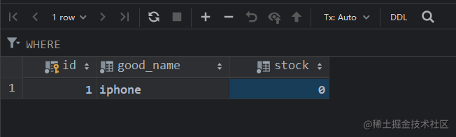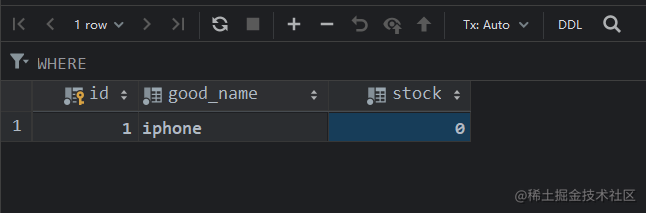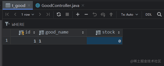 <update id="descGoodStock"> update t_desc.t_good set t_good.stock = t_good.stock - 1 where id = #{id}</update>考慮到 update 語句,若根據(jù)主鍵索引作為條件進(jìn)行更新,會對數(shù)據(jù)庫的某一行加上行鎖(數(shù)據(jù)庫開啟事務(wù)自動提交),所以我們加上 stock > 0 的判斷條件