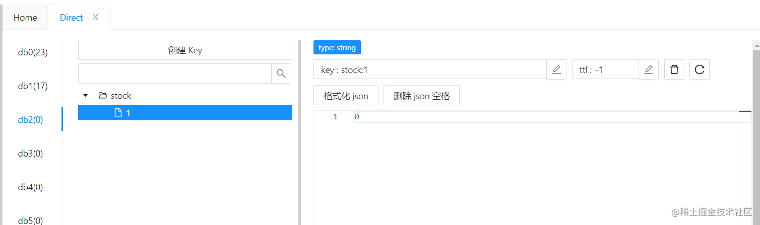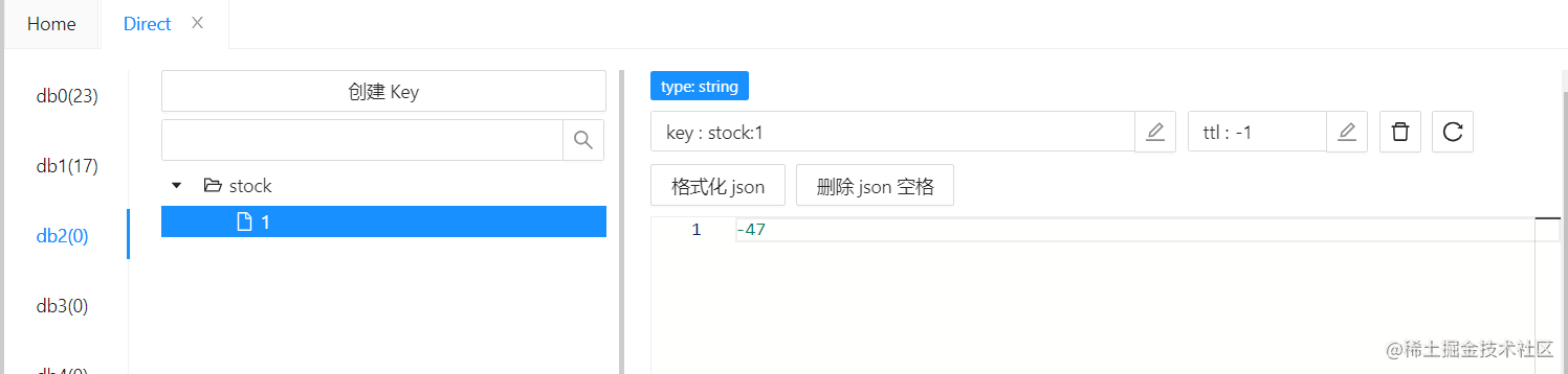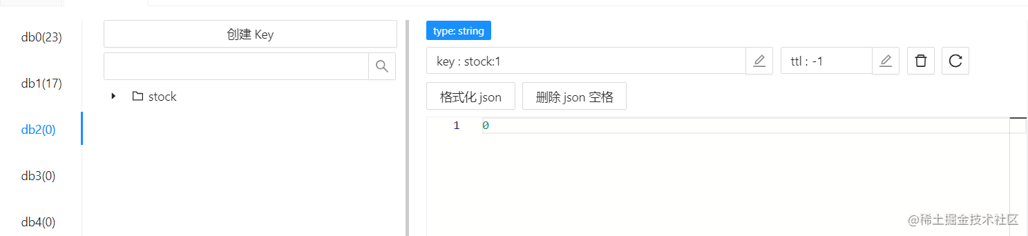 @PostMapping("/redis") public Map<String, Object> goodDescControllerByRedis(Long id) throws InterruptedException {HashMap<String, Object> ret = new HashMap<>();ret.put("info", "fail, 扣減失敗");// 查詢 Redis 中的庫存Integer stock = (Integer) redisTemplate.opsForValue().get(key + id);Thread.sleep(100);if (stock <= 0) { return ret;}// 扣減 redis 中庫存Long decrement = redisTemplate.opsForValue().decrement(key + id);if (decrement >= 0) { // 扣減數(shù)據(jù)庫庫存 goodMapper.descGoodStock(id); ret.put("info", "success, 扣減成功");}return ret; }其實(shí) decrement 方法是原子性的,可以不用對庫存先進(jìn)行查詢的操作,只需要判斷扣減后的數(shù)是否大于 0 即可。但是如果并發(fā)量高的話,建議還是加上判斷的邏輯,可以提高 Redis 的性能,不用每次進(jìn)行 decrement 操作;
