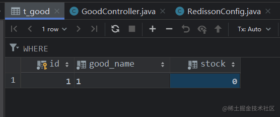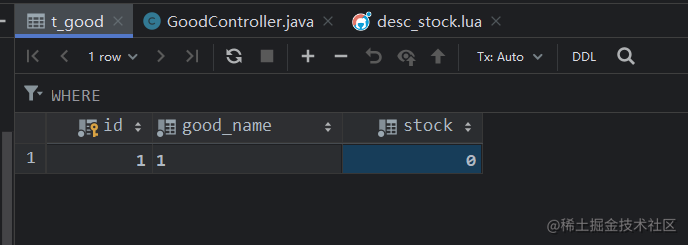 private static final DefaultRedisScript<Long> DECREASE_GOOD_STOCK_SCRIPT = new DefaultRedisScript<>();static { DECREASE_GOOD_STOCK_SCRIPT.setLocation(new ClassPathResource("/lua/desc_stock.lua")); // 設(shè)置返回值類型 DECREASE_GOOD_STOCK_SCRIPT.setResultType(Long.class);}@PostMapping("/lua")public Map<String, Object> goodDescControllerByLUA(Long id) { List<String> keys = new ArrayList<>(); keys.add("stock:" + id); HashMap<String, Object> ret = new HashMap<>(); ret.put("info", "fail, 扣減失敗"); Long execute = redisTemplate.execute(DECREASE_GOOD_STOCK_SCRIPT, keys); if (execute == 1) {goodMapper.descGoodStock(id);ret.put("info", "success, 扣減成功"); } return ret;}結(jié)果:Redis 和 MySQL 中的庫存均為 0 ,沒有超賣