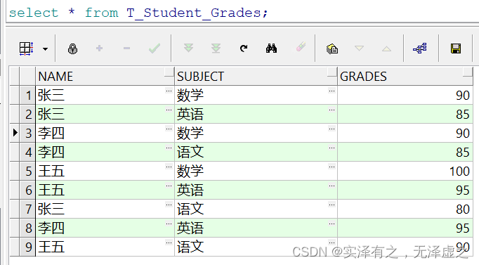 select * from T_Student_Gradespivot(sum(grades)for name in("張三","李四","王五"))返回結(jié)果如下:按指定科目統(tǒng)計(jì)所有學(xué)生的總成績,并將學(xué)生姓名字段行轉(zhuǎn)列顯示(此時(shí)雖然用到了聚合函數(shù)sum,由于SUBJECT字段也一并顯示,因此sum函數(shù)并沒有起到效果,顯示依舊是每一個(gè)學(xué)生的各科具體成績)。