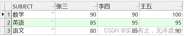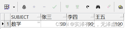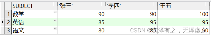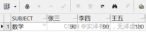 select * from T_Student_Gradespivot(max(grades)for name in ("張三" as 張三,"李四" as 李四,"王五" as 王五))where subject="數(shù)學(xué)"返回結(jié)果如下:按指定科目統(tǒng)計(jì)所有學(xué)生的最高成績,并將學(xué)生姓名字段行轉(zhuǎn)列,并且只顯示數(shù)學(xué)這一科目的成績(此時(shí)雖然用到了聚合函數(shù)max,由于SUBJECT字段也一并顯示,因此max函數(shù)并沒有起到效果,依舊是顯示每一個(gè)學(xué)生的各科具體成績)。