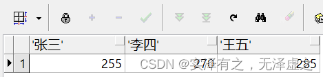 select * from (select name,grades from T_Student_Grades)pivot(sum(grades)for name in ("張三","李四","王五"))返回結(jié)果如下:統(tǒng)計(jì)每一個(gè)學(xué)生的所有科目總成績,并將學(xué)生姓名字段行轉(zhuǎn)列(SUBJECT字段沒有顯示)。