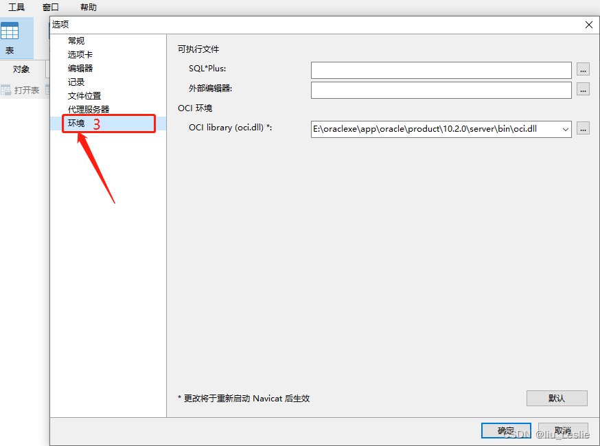 2、進(jìn)入環(huán)境界面后,可以看到OCI環(huán)境選項(xiàng)中的 --> OCI library (oci.dll) * :E:\oraclexe\app\oracle\product\10.2.0\server\bin\oci.dll(此處的路徑是我安裝Navicat軟件后默認(rèn)存在的),我們需要修改此oci.dll文件的路徑,否則會(huì)報(bào)錯(cuò)。