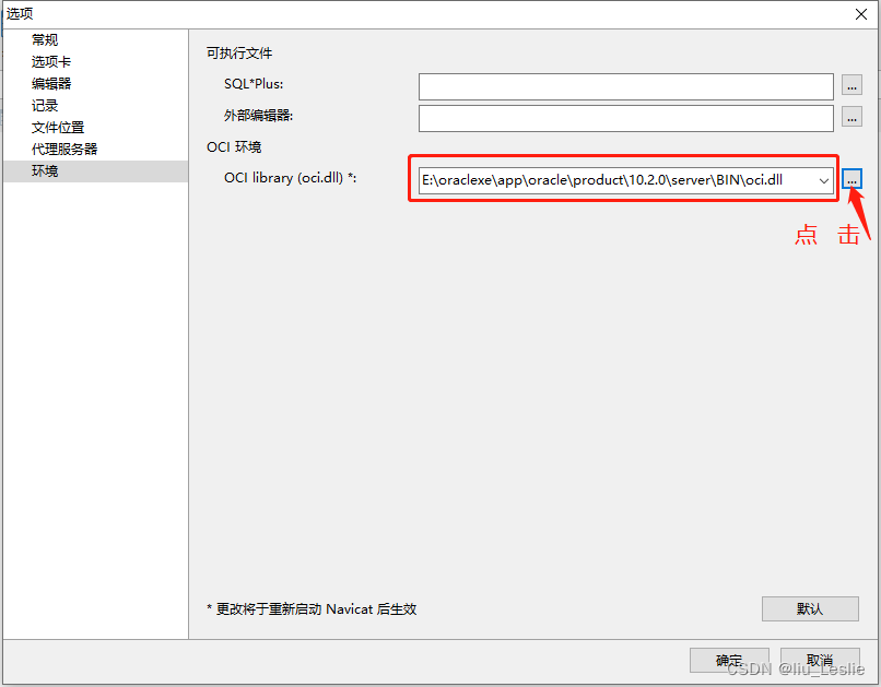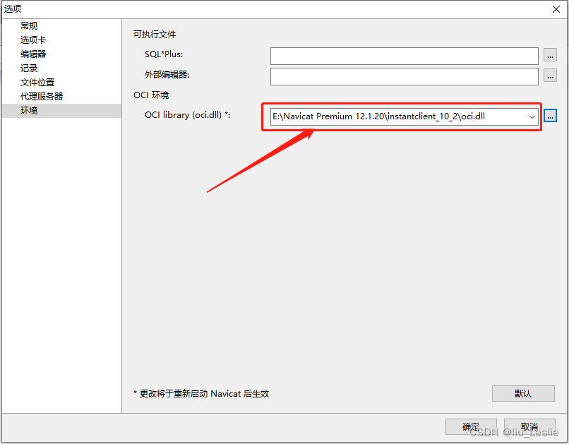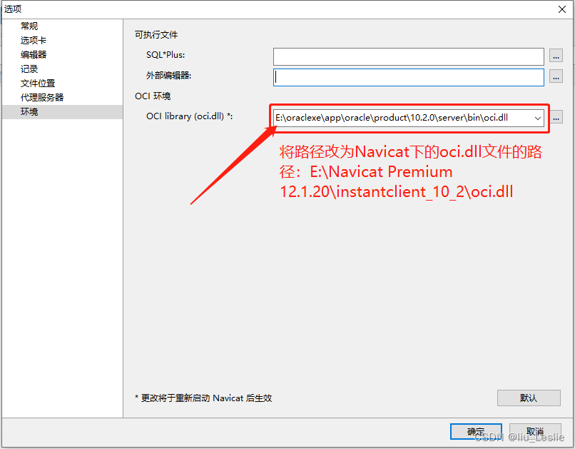 將Oracle路徑改為Navicat下的oci.dll文件的路徑。 E:\Navicat Premium 12.1.20\instantclient_10_2\oci.dll