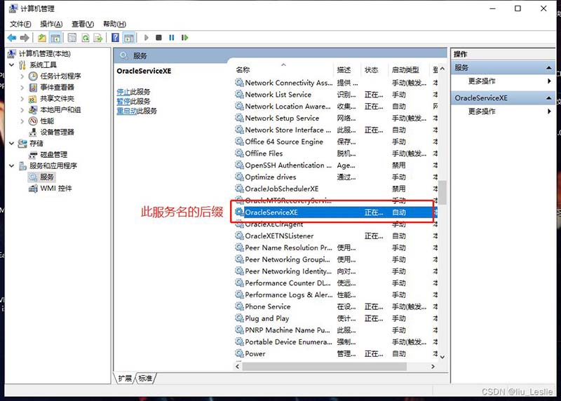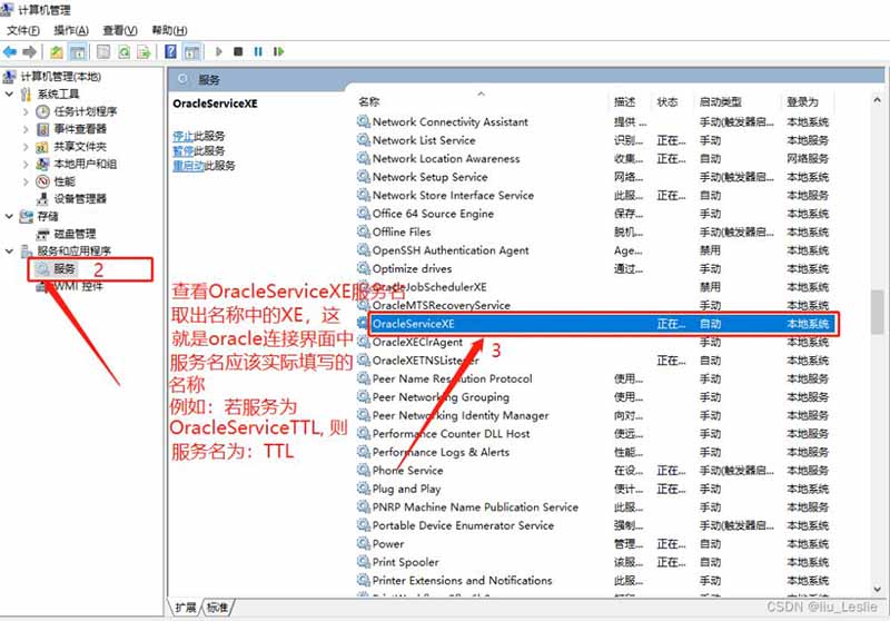 5、新建連接中有一點(diǎn) “服務(wù)名” 需要注意,此服務(wù)名需要通過:右擊計(jì)算機(jī)(我的電腦) --> 管理 --> 找到服務(wù)和應(yīng)用程序 --> 點(diǎn)擊服務(wù)打開服務(wù)列表,==找到OracleServiceXE服務(wù)名,==將 “XE” 作為服務(wù)名填入連接界面中的服務(wù)名選項(xiàng)。如下圖: