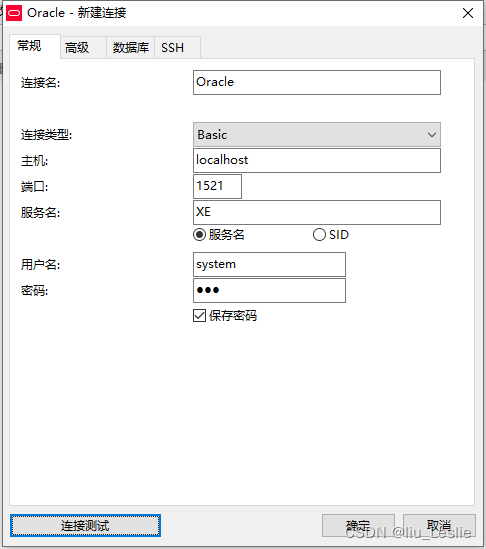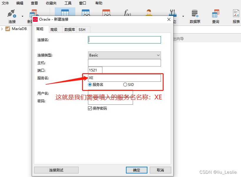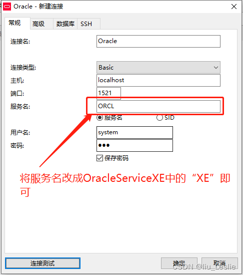將服務(wù)名改成XE;“XE”就是之前從計(jì)算機(jī)管理中的服務(wù)與應(yīng)用程序中查找到的服務(wù)OracleServiceXE中截取的后綴服務(wù)名。如下圖: