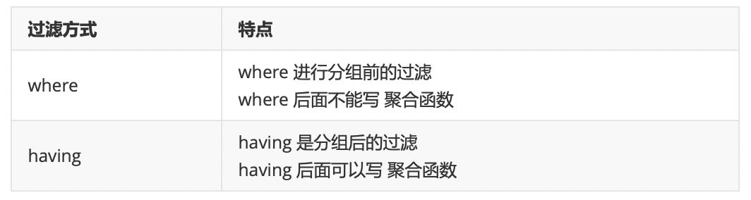# 查詢平均薪資大于6000的部門-- 需要在分組后再次進行過濾,使用 having SELECTdept_name ,AVG(salary)FROM emp WHERE dept_name IS NOT NULL GROUP BY dept_name HAVING AVG(salary) > 6000 ;where 與 having 的區別: