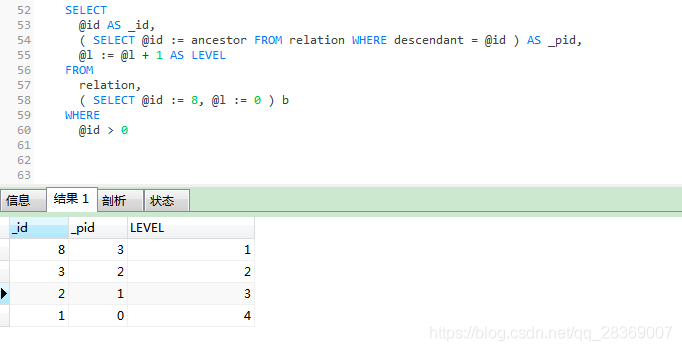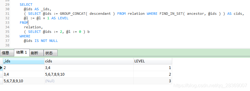 查詢父級為 2 的下級 無限級查詢SELECT@ids AS _ids,( SELECT @ids := GROUP_CONCAT( descendant ) FROM relation WHERE FIND_IN_SET( ancestor, @ids ) ) AS cids,@l := @l + 1 AS LEVEL FROMrelation,( SELECT @ids := 2, @l := 0 ) b WHERE@ids IS NOT NULL
