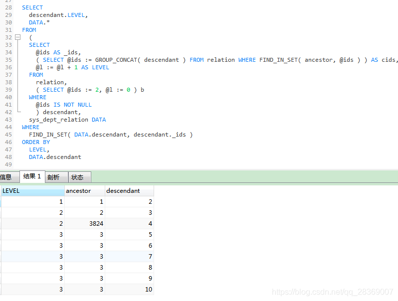 SELECTdescendant.LEVEL,DATA.* FROM(SELECT@ids AS _ids,( SELECT @ids := GROUP_CONCAT( descendant ) FROM relation WHERE FIND_IN_SET( ancestor, @ids ) ) AS cids,@l := @l + 1 AS LEVEL FROMrelation,( SELECT @ids := 2, @l := 0 ) b WHERE@ids IS NOT NULL ) descendant,sys_dept_relation DATA WHEREFIND_IN_SET( DATA.descendant, descendant._ids ) ORDER BYLEVEL,DATA.descendant