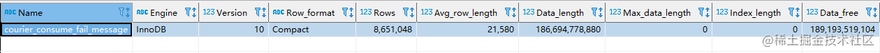 三、清理碎片下面是執行 OPTIMIZE TABLE courier_consume_fail_message; 后的統計。