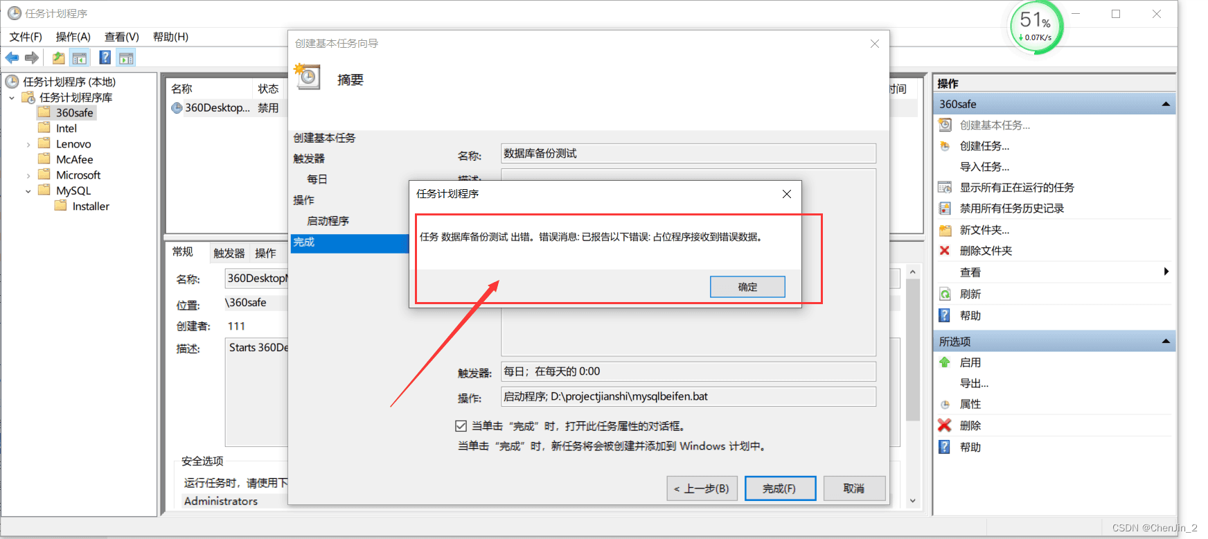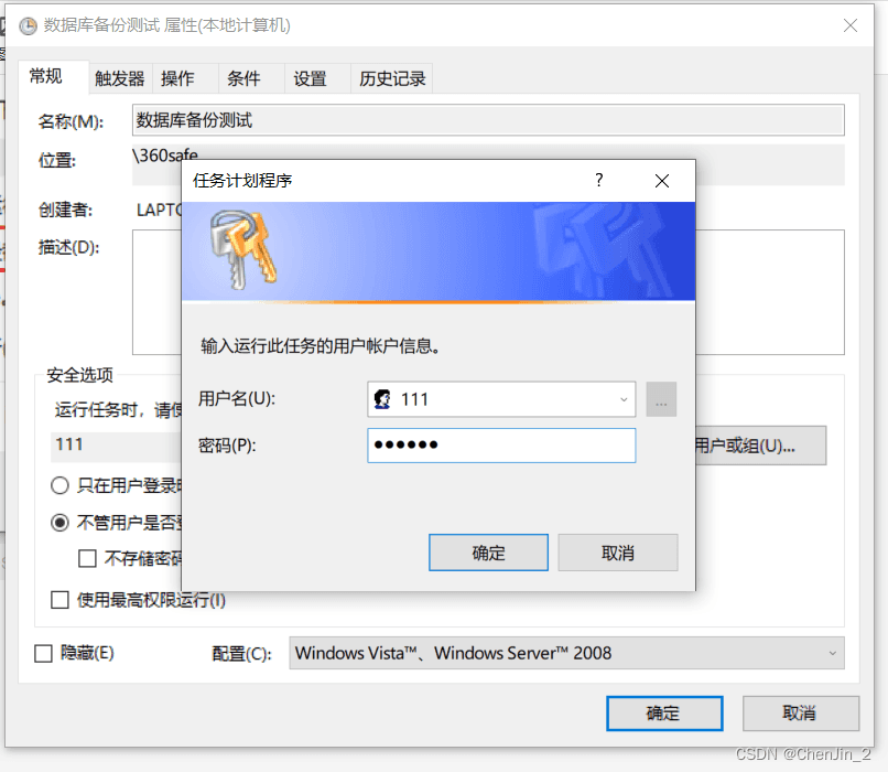 目錄1、編寫腳本xxx.bat2、實現定時任務2.1、打開任務計劃程序2.2、創建基本任務2.3、輸入名稱 點擊下一步2.4、設置觸發器 點擊下一步2.4、設置執行時間 點擊下一步2.5、設置自動程序 點擊下一步2.6、選擇腳本所在位置 點擊下一步2.7、點擊完成2.8、設置安全選項2.9、點擊確定輸入自己電腦密碼再次點擊確定。2.10、任務設置成功總結1、編寫腳本xxx.bat@echo offecho 設置MySql數據庫的連接信息set host=127.0.0.1set port=3306set user=rootset pass=123456echo 設置要備份MySql數據庫名稱set dbname=projectmonitoringecho 獲取當天的日期格式,例如:2022-12-13-14-30-40set backup_date=%date:~0,4%-%date:~5,2%-%date:~8,2%-%time:~0,2%-%time:~3,2%-%time:~6,2%echo 設置備份文件的路徑set backupfile=D:\projectjianshi\sql\mysql\%dbname%-%backup_date%.sqlecho 使用mysqldump對指定的MySql進行備份echo 注意路徑中有空格的要加上雙引號'C:\Program Files\MySQL\MySQL Server 5.7\bin\mysqldump' -h%host% -P%port% -u%user% -p%pass% -c --add-drop-table %dbname% > %backupfile%echo 刪除過期文件,這里是超過30天就刪除forfiles /p D:\projectjianshi\sql\mysql\ /s /m *.sql /d -30 /c 'cmd /c del @file /f'exist2、實現定時任務2.1、打開任務計劃程序