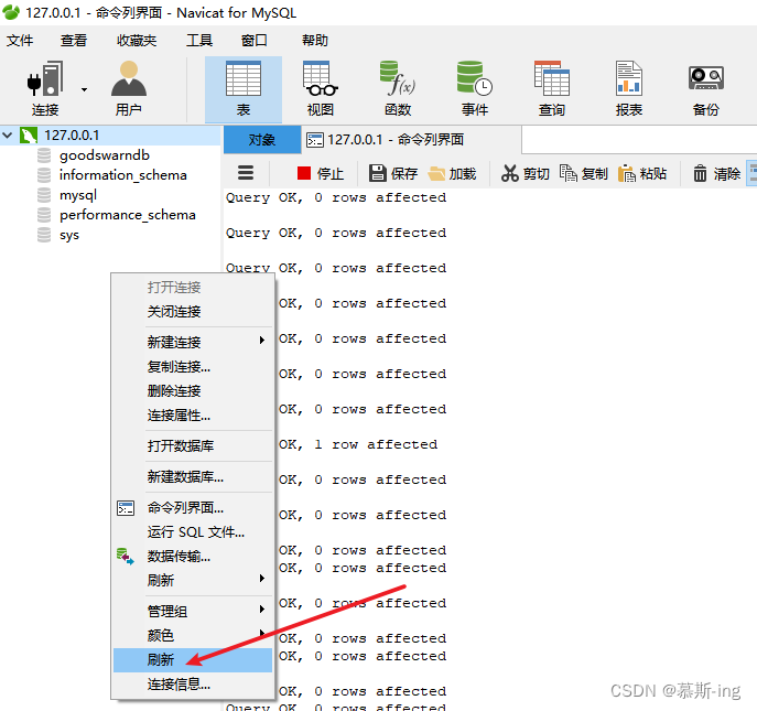 4、刷新,否則無法看到新增的數(shù)據(jù)庫、數(shù)據(jù)表、數(shù)據(jù)表中的記錄