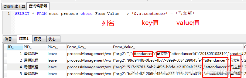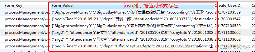 舉個(gè)栗子1、首先我們看到數(shù)據(jù)表中,F(xiàn)orm_Value_一列是josn格式存在的,又想通過其中的一組或者幾組鍵值對(duì)來進(jìn)行查詢。