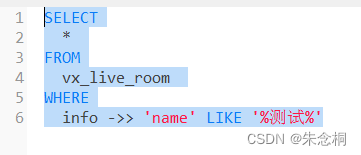 **注意:**like 查詢varchar類型時(shí)要將單箭頭變?yōu)殡p箭頭直接匹配值模糊查詢 ->>