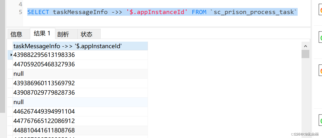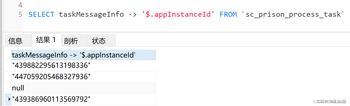 2、使用 json_extract 函數(shù)查詢,json_extract(字段, “$.json屬性”)