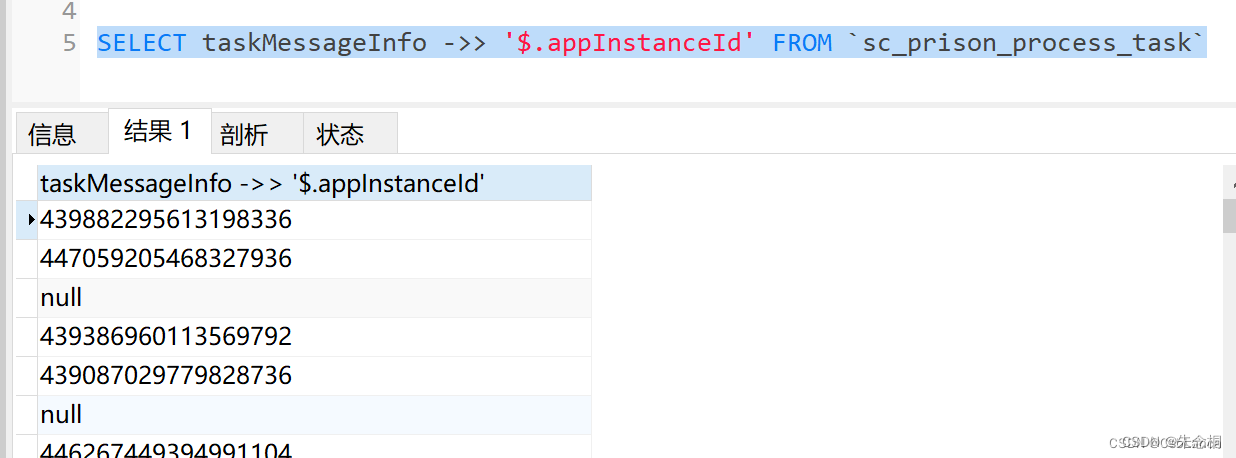 1、使用 字段 -> ‘$.json’ 屬性’ 進(jìn)行查詢條件