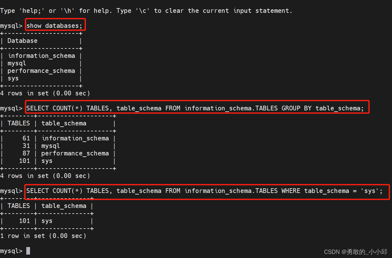 SELECT COUNT(*) TABLES, table_schema FROM information_schema.TABLES GROUP BY table_schema;2、查詢指定數據庫的表的數量